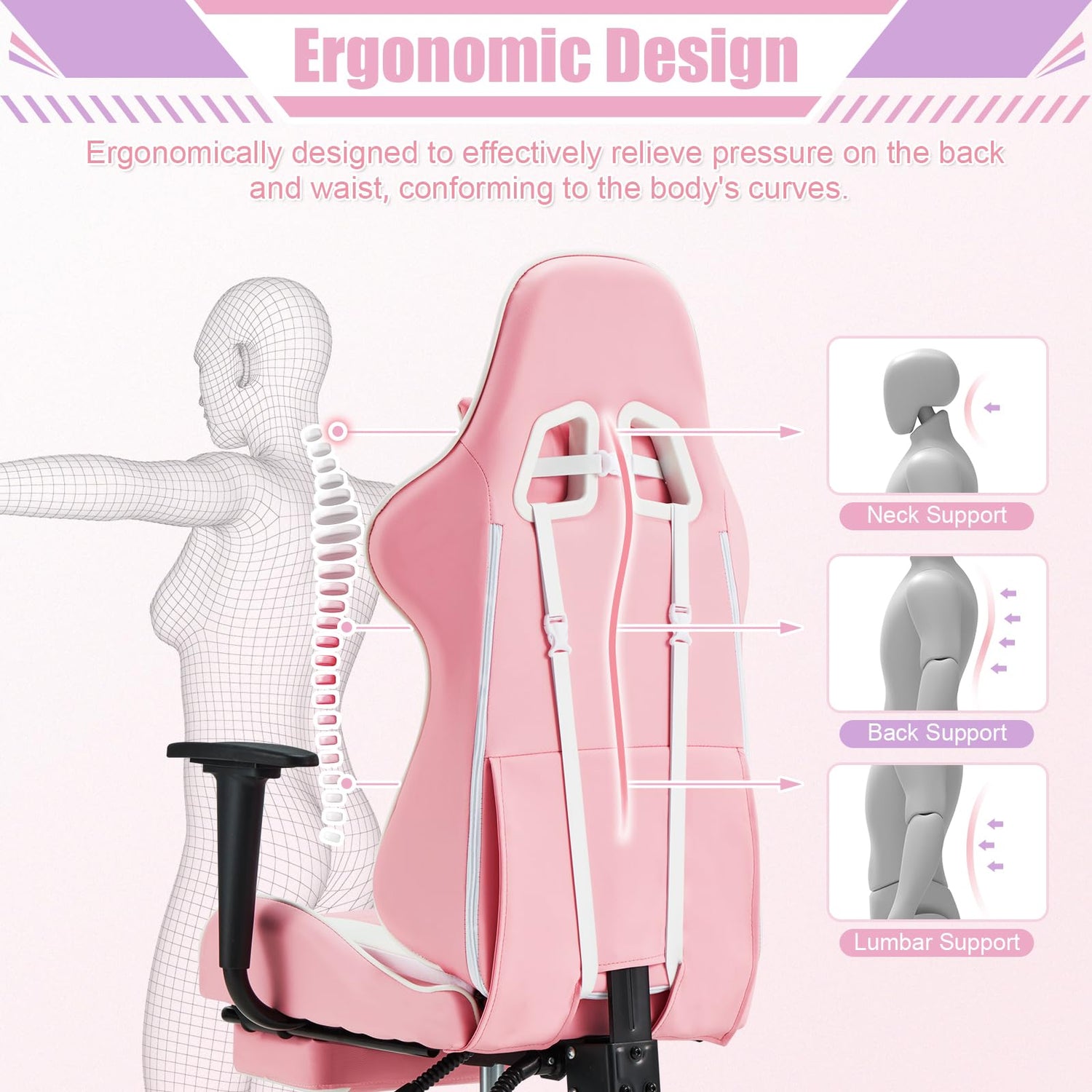 ECOTOUGE PC Gaming Chair Massage Ergonomic Office Desk Chair Racing PU Leather Recliner Swivel Rocker with Headrest and Lumbar Pillow, Pink-White