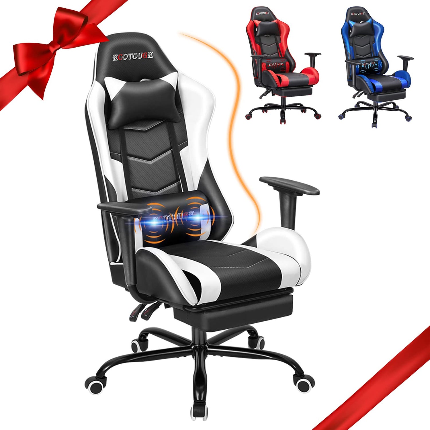 ECOTOUGE PC Massage Gaming Chair with Footrest Ergonomic Office Desk Chair Racing PU Leather Recliner Swivel Rocker with Headrest and Lumbar Pillow,White