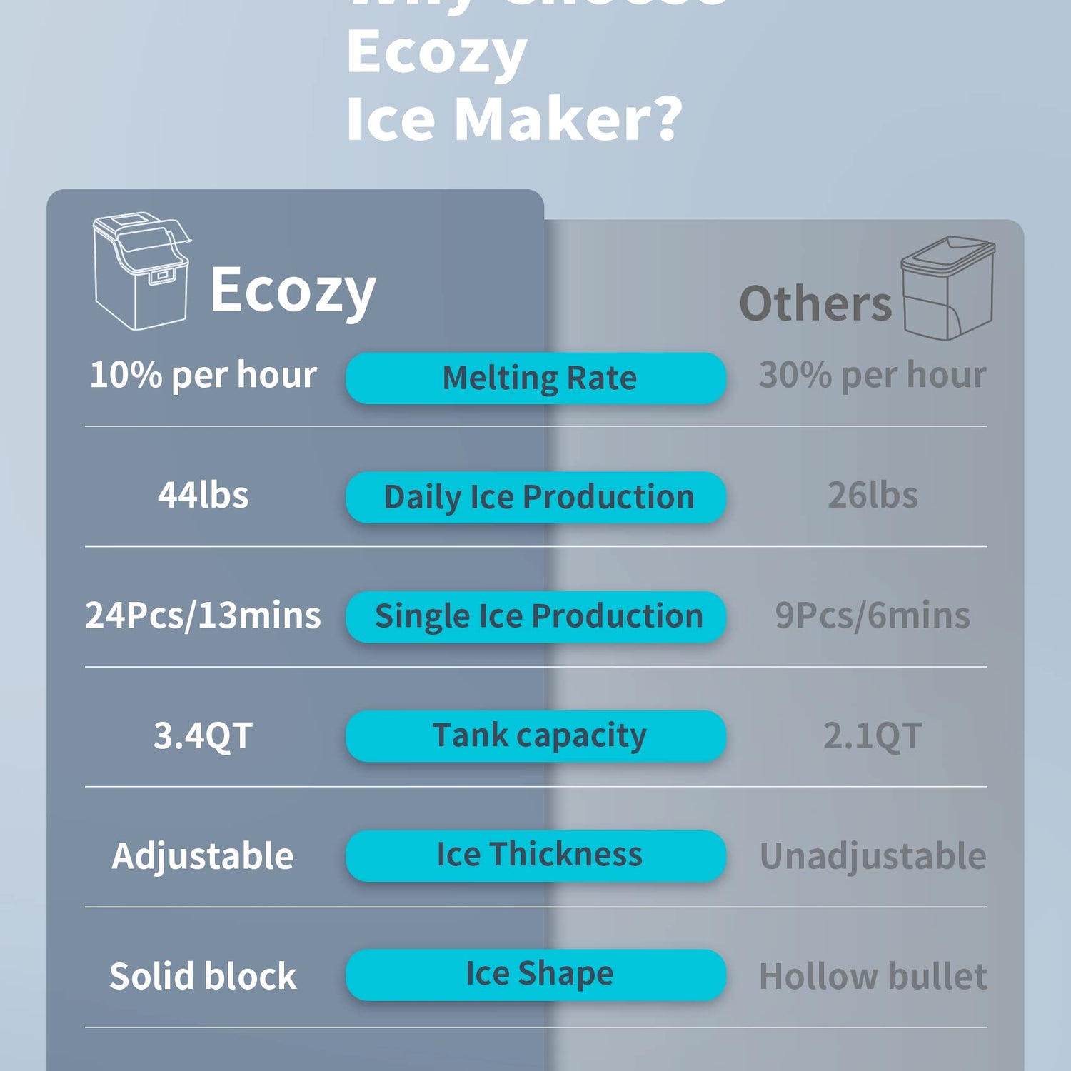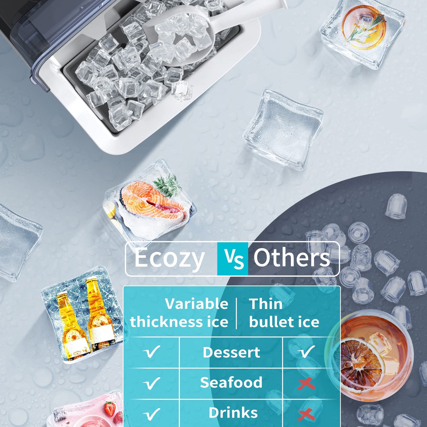 - Solid & Slow-melting Ice: The Ecozy ice make creates clear and solid ice cubes, which are different from hollow bullet-shaped ice. The ice is crystal clear with no air bubbles, and it melts slowly, preserving the flavor of your drink for a longer time. Enjoy your beverage to the fullest with this incredible machine