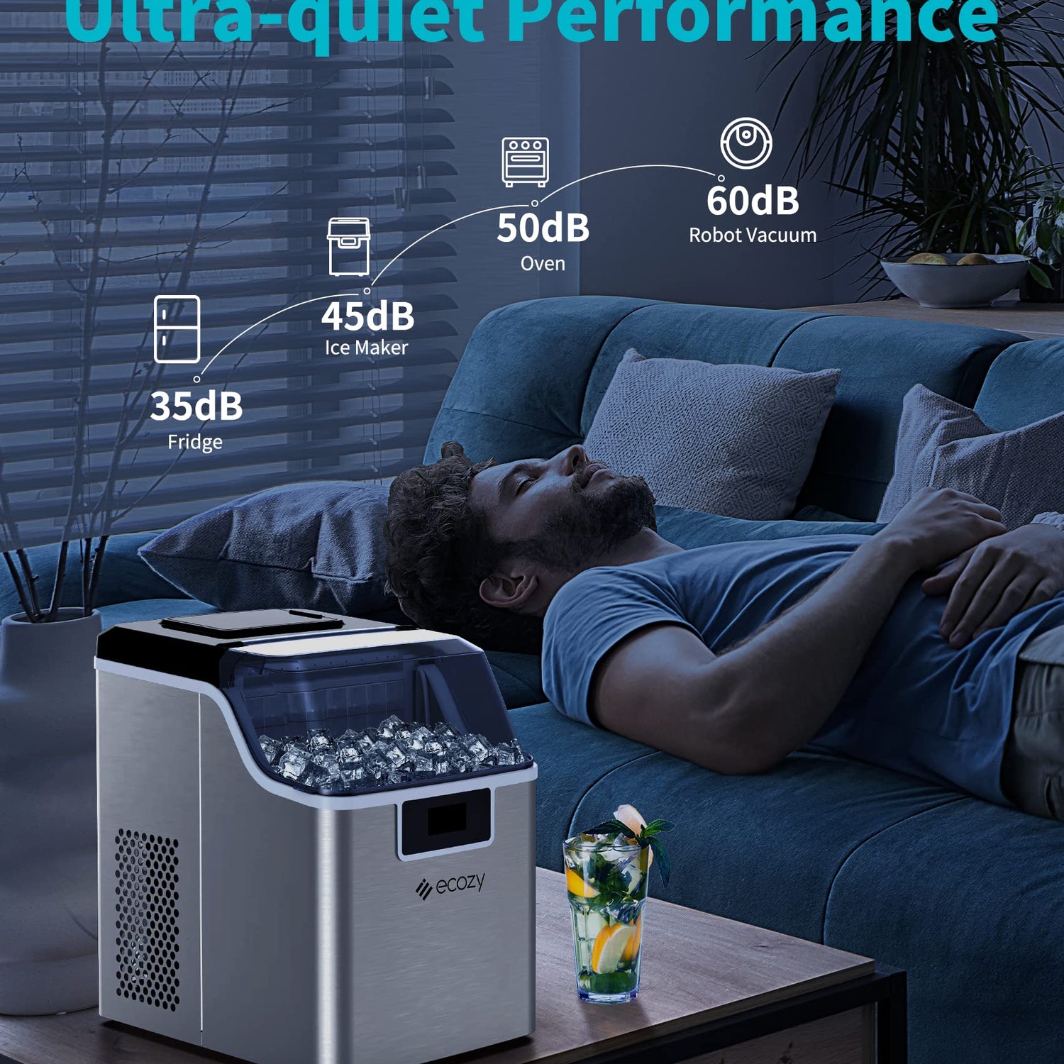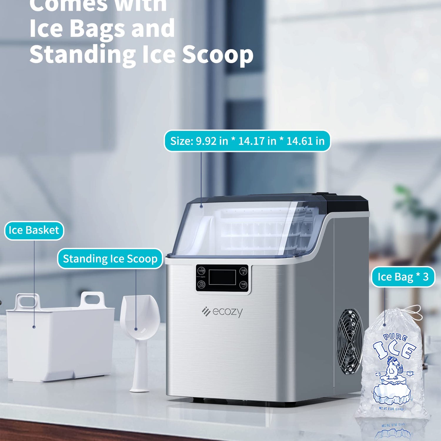 ecozy Countertop Ice Makers, 45lbs Per Day, 24 Cubes Ready in 13 Mins, Stainless Steel Housing, Auto Self-Cleaning Ice Maker with Ice Bags and Ice Scoop for Kitchen Office Bar Party