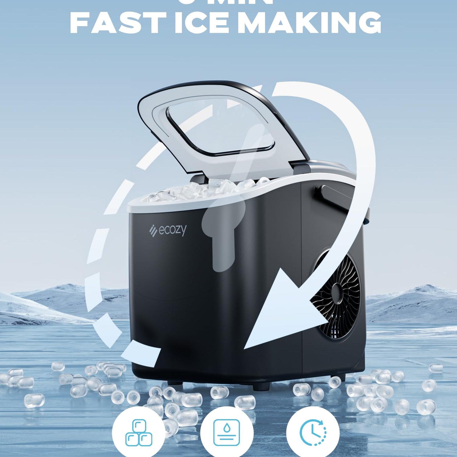 ecozy Ice Makers Countertop, Portable Ice Machine with Carry Handle, Ice in 6Mins, 26 lbs/Day, Auto-Cleaning Ice Maker with Basket and Scoop, for Home/Kitchen/Camping/RV