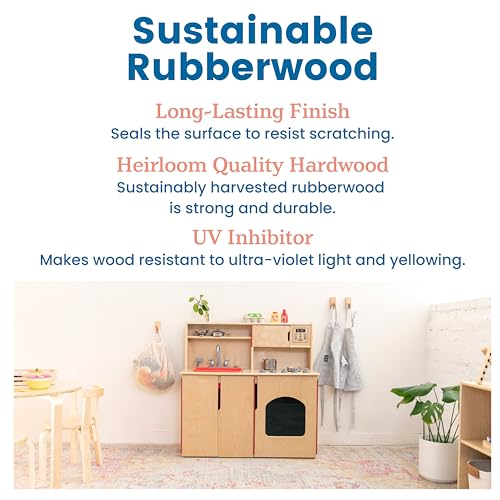 - Certified Safe: Institutional quality wooden play kitchen is GREENGUARD [GOLD] Certified for low VOCs, TSCA and CPSIA compliant; cut-out handles allow adults to pick up and transport