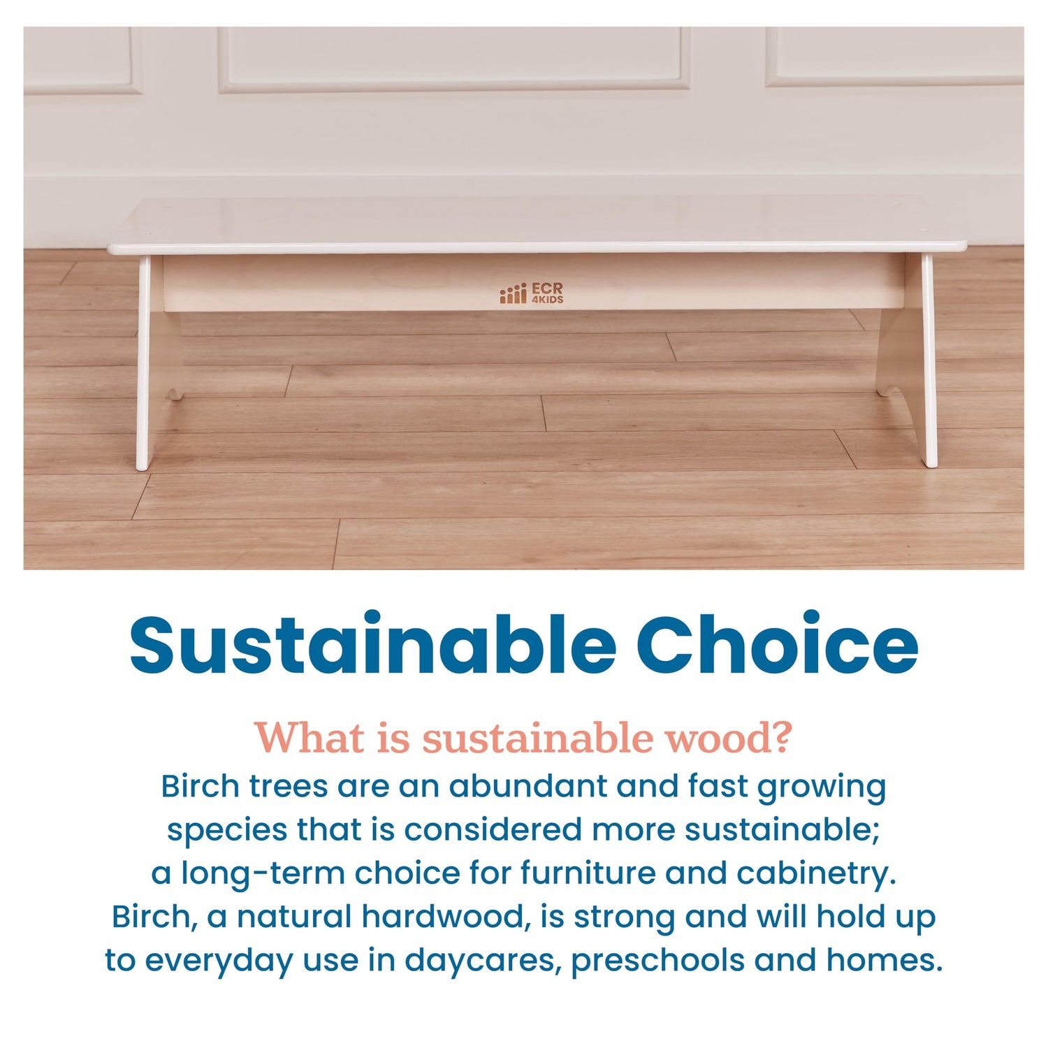 Details: Introduce a functional and attractive seating option to your playroom, bedroom, or daycare with ECR4Kids Kiddo Bench. This versatile wooden bench provides the perfect place for children to eat, read, socialize, or put on shoes in the classroom or at home. Proportionally sized kids furniture promotes confidence and independence, letting children take ownership of their learning as they navigate a kid-sized environment. The multipurpose classroom bench can be used for seated activities, storytime, or snack time. Place the entryway bench in the mudroom to assist with transitions. The versatile kids’ bench can also double as a low-to-the-ground table surface, perfect for playtime or creative activities. The lightweight design allows parents, teachers, and educators to effortlessly move the wood bench to where you need it most. Wide-set legs offer stability while sitting. Use alone, pair with a kids table, or use with an ECR4Kids Wall-Mounted Coat Locker to complete your space; sold separately. Classroom furniture is constructed from sustainably harvested birch plywood with a durable finish sealing the wood surface and resisting scratching. A UV inhibitor helps furniture resist ultraviolet light and yellowing. Natural birch plywood is extremely durable and will hold up to everyday use in early childhood environments.