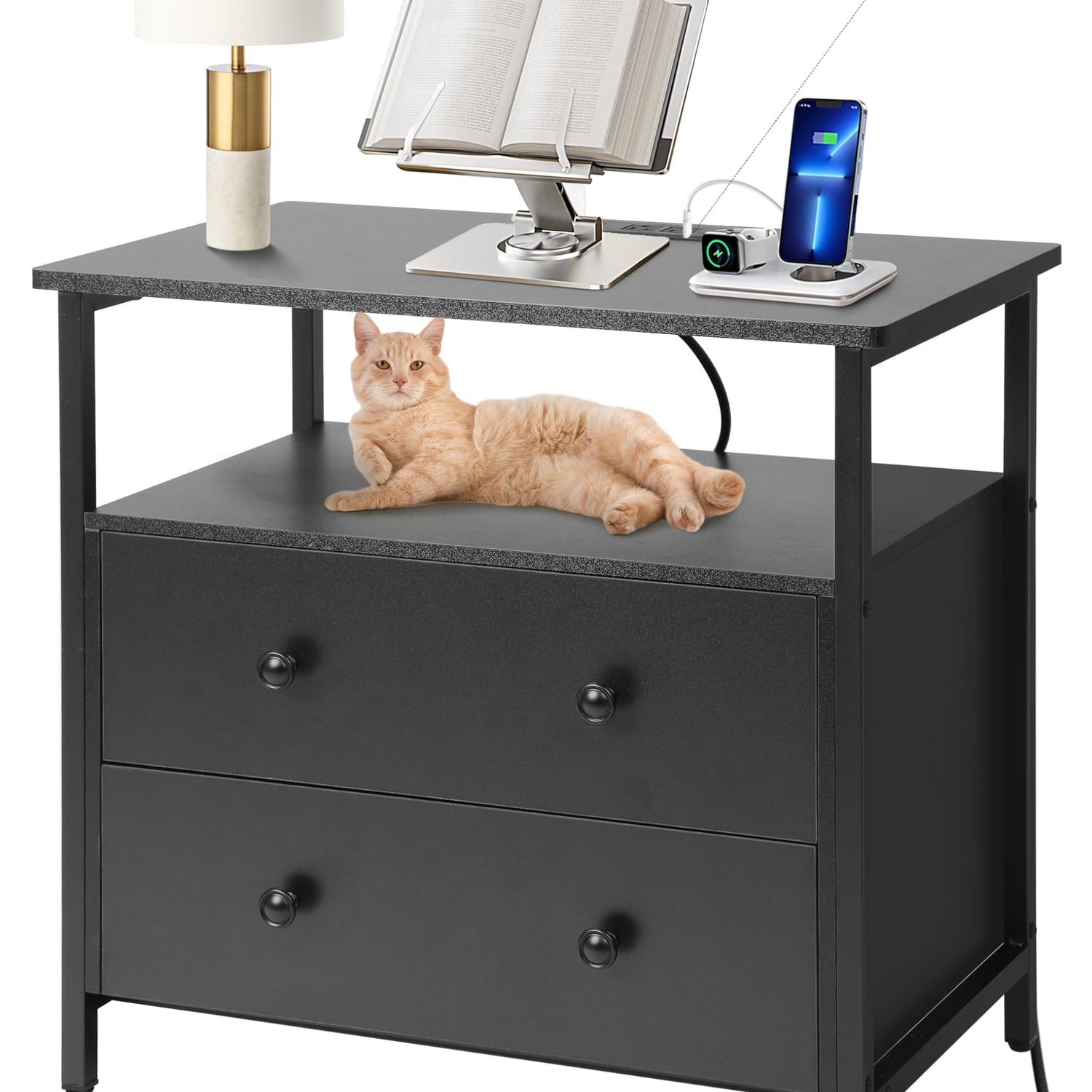 Edbuosy 27 inch Wide Nightstand with Charging Station, Bedside Table with Open Shelf, 2 Drawers Small Wood Dresser, End Side Table for Bedroom (Black)