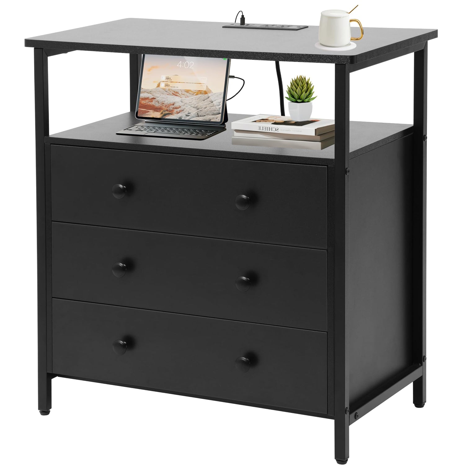 Edbuosy 3 Wooden Drawers Night Stand, 27 Inch Wide Nightstand with Charging Station and Adjustable Drawers, Bedside Table for Living Room/Bedroom/Office, Black.