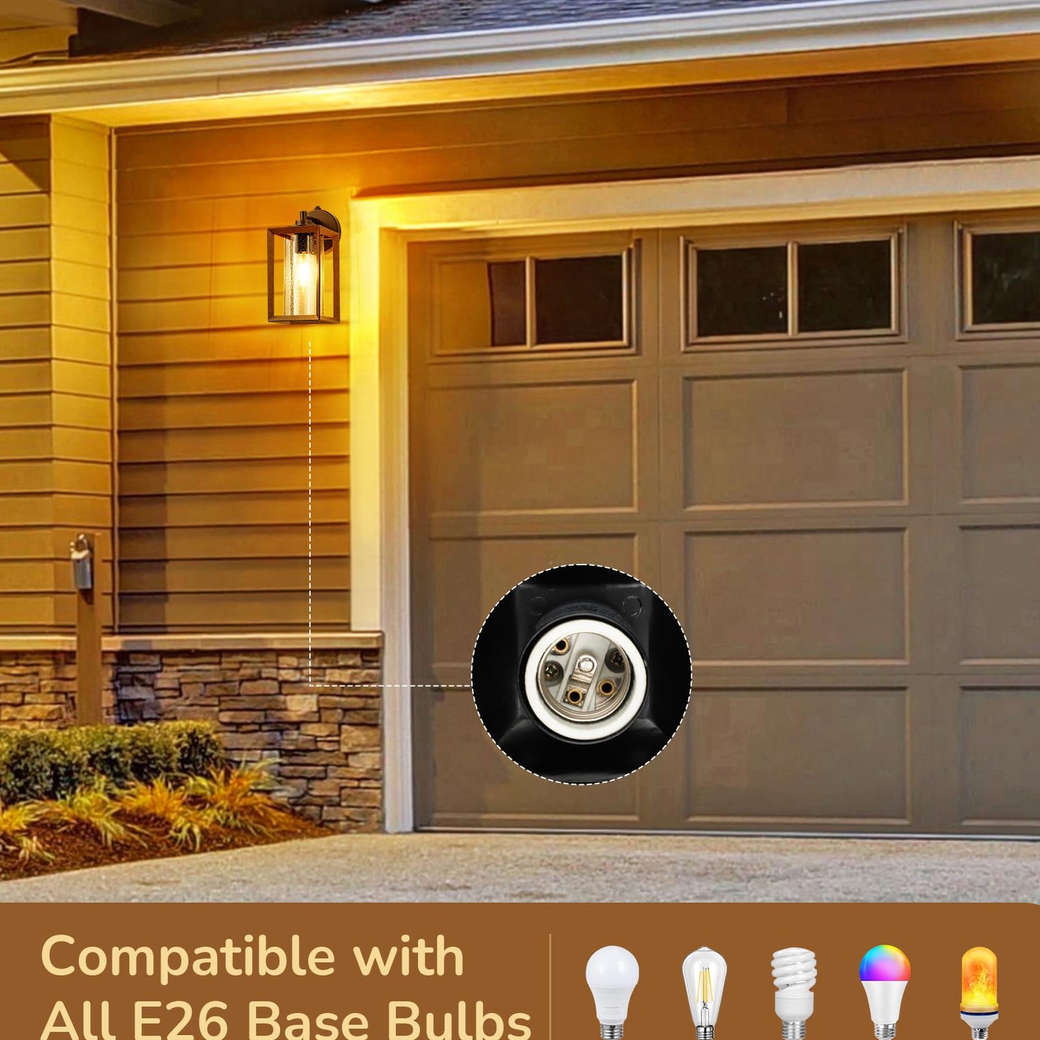 - [Suitable for E26 Bulbs] Our exterior porch light is designed to be compatible with all E26 base bulbs (Max 60W), such as LED, incandescent, CFL, and halogen bulbs to experience different lighting effects; open design, convenient to replace and clean bulbs as needed (NOTE: Bulb Not Included)