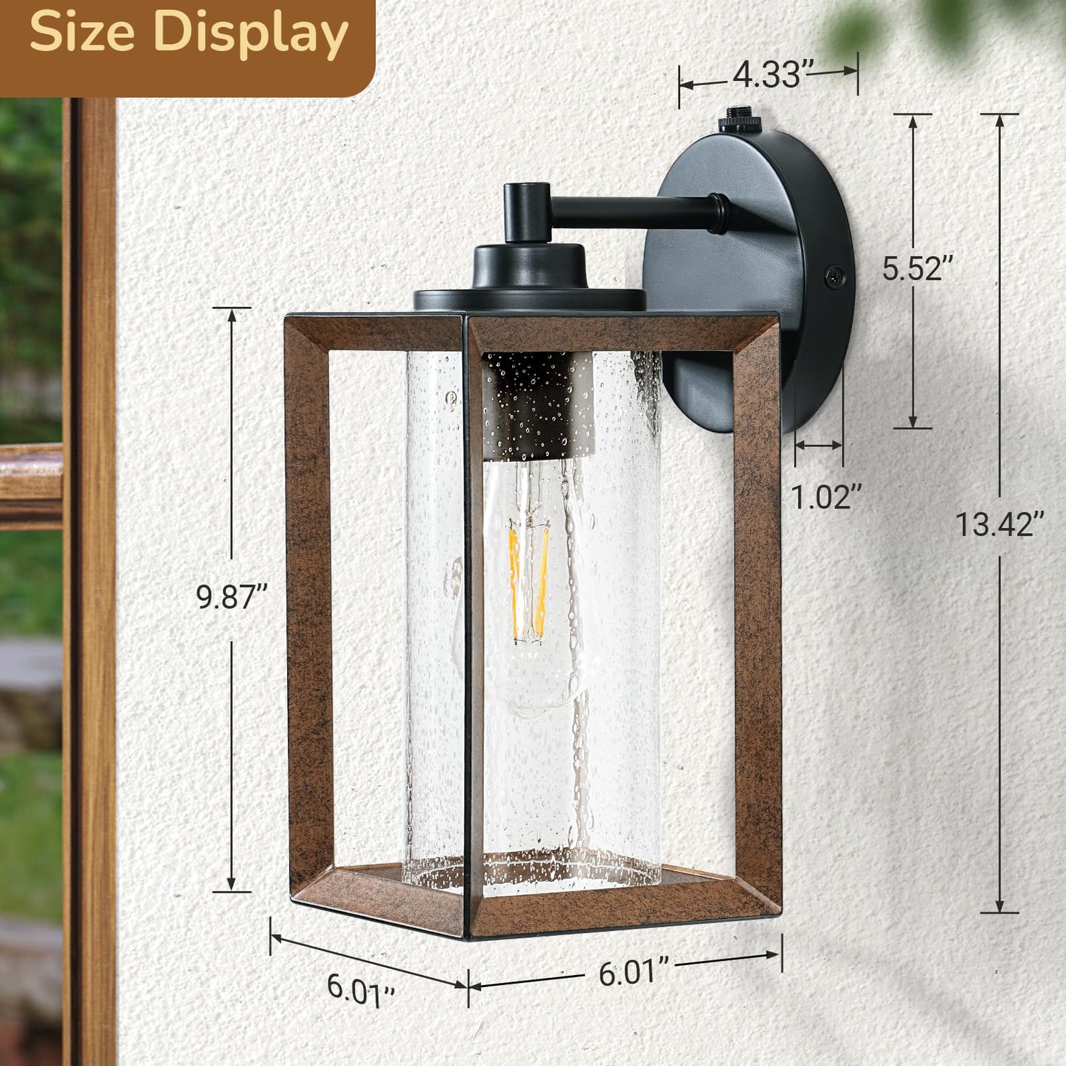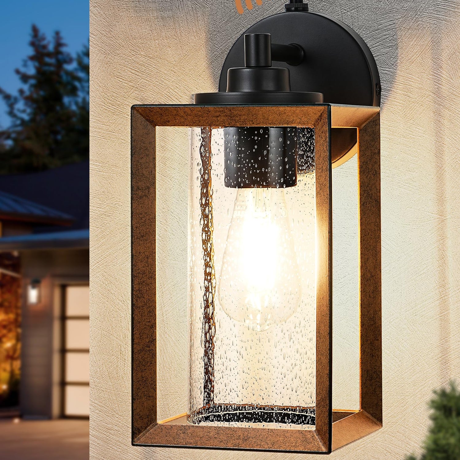 - [Industrial Farmhouse Design] Designed with 3-dimensional metal frame & clear seed bubble glass, our exterior wall lights can turn your home decor into a rustic, vintage and farmhouse vibe; woodgrain paint finish of lamp frames combined with matte black base plate creates a simple and elegant look