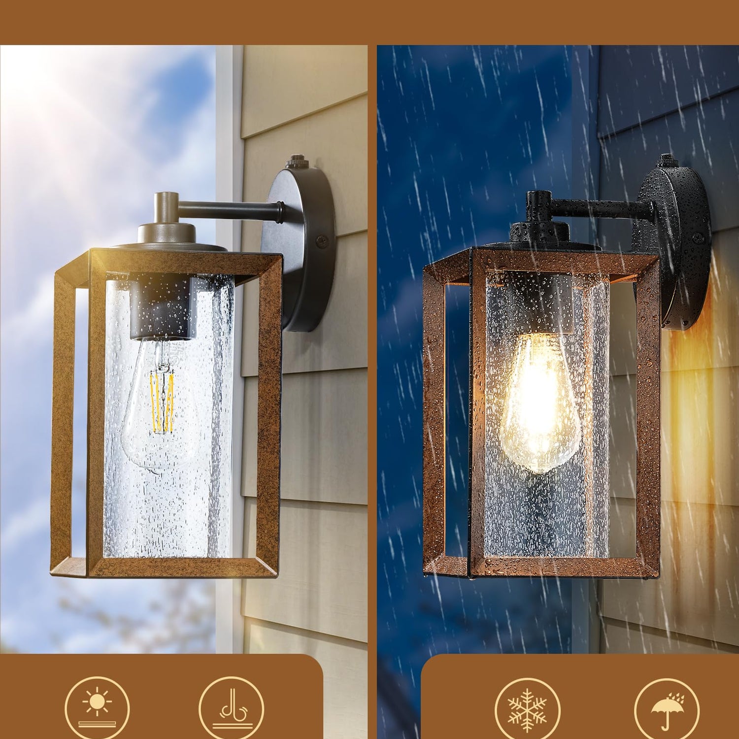 - [Superior Anti-Rust & Weatherproof] Crafted with attention to detail, this outdoor wall lantern features anti-rust metal and woodgrain painted finish; built to endure rain, snow, and other outdoor conditions and stay rust and corrosion resistant for many years, longevity and durability for outdoor