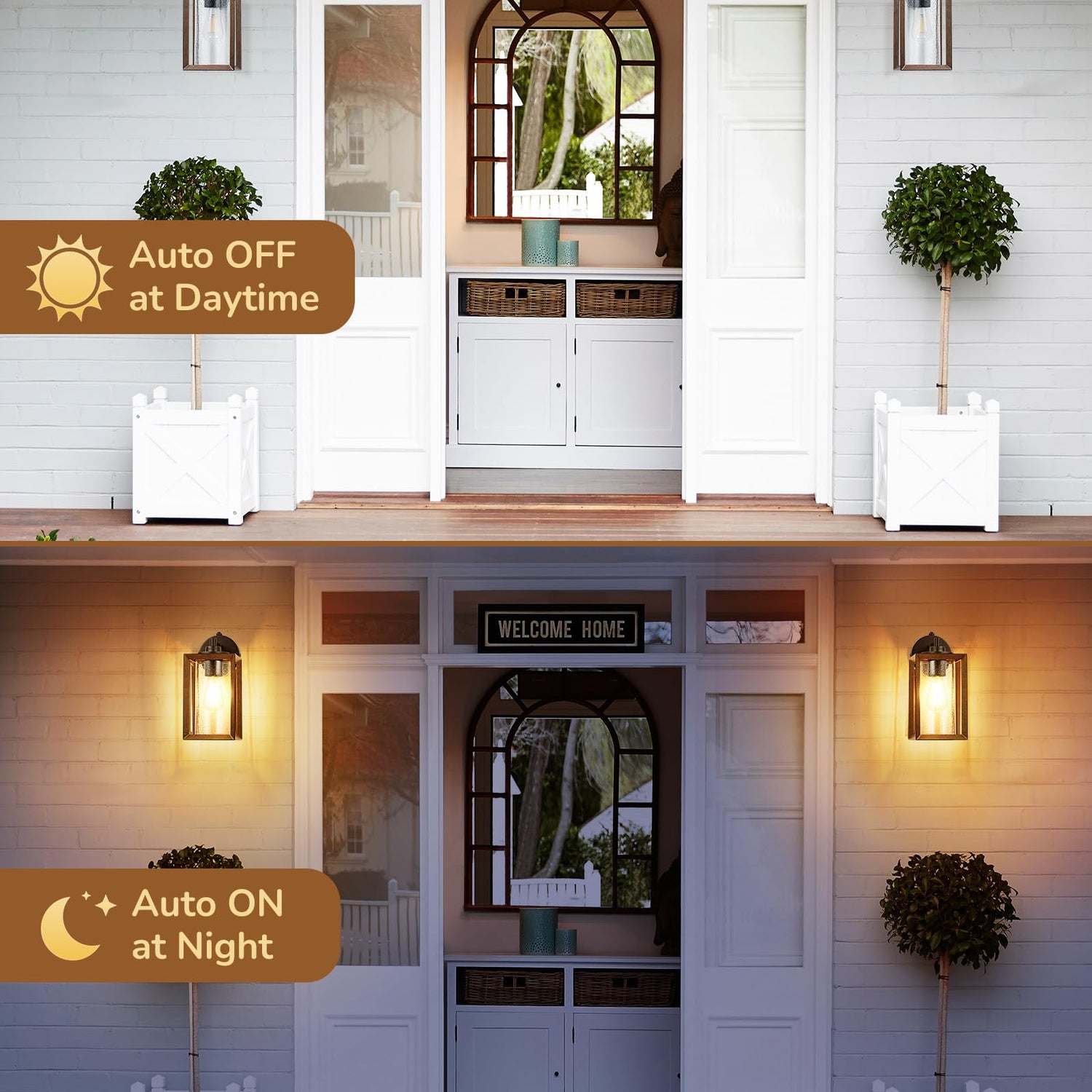 - [New Dusk-to-Dawn Sensor] Built in smart photocell sensor in our dusk to dawn outdoor light fixture, can sensitively detect ambient light; automatically turns ON at dusk and OFF at dawn, adding an element of safety to your home; No need for manual switches, more convenient and hassle-free