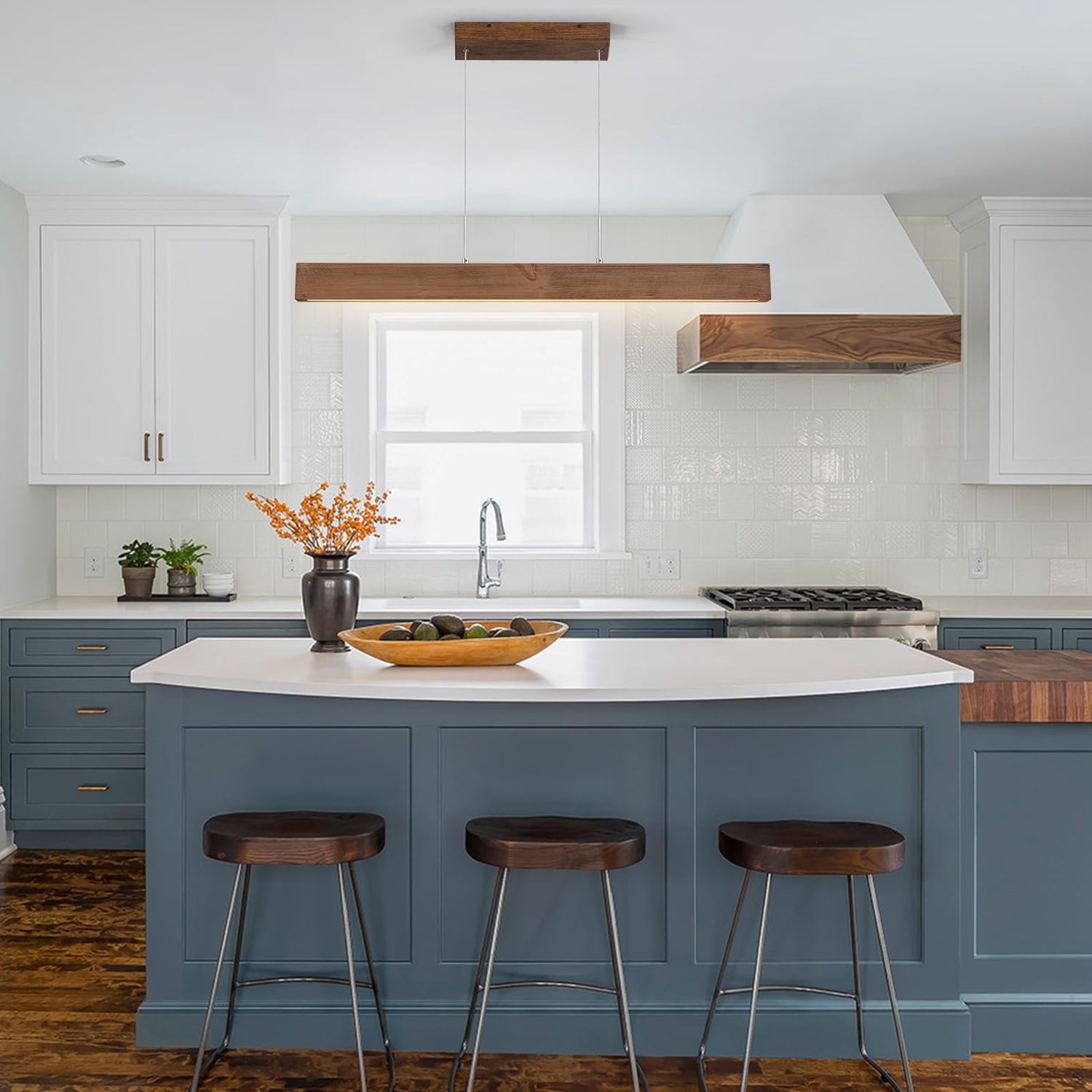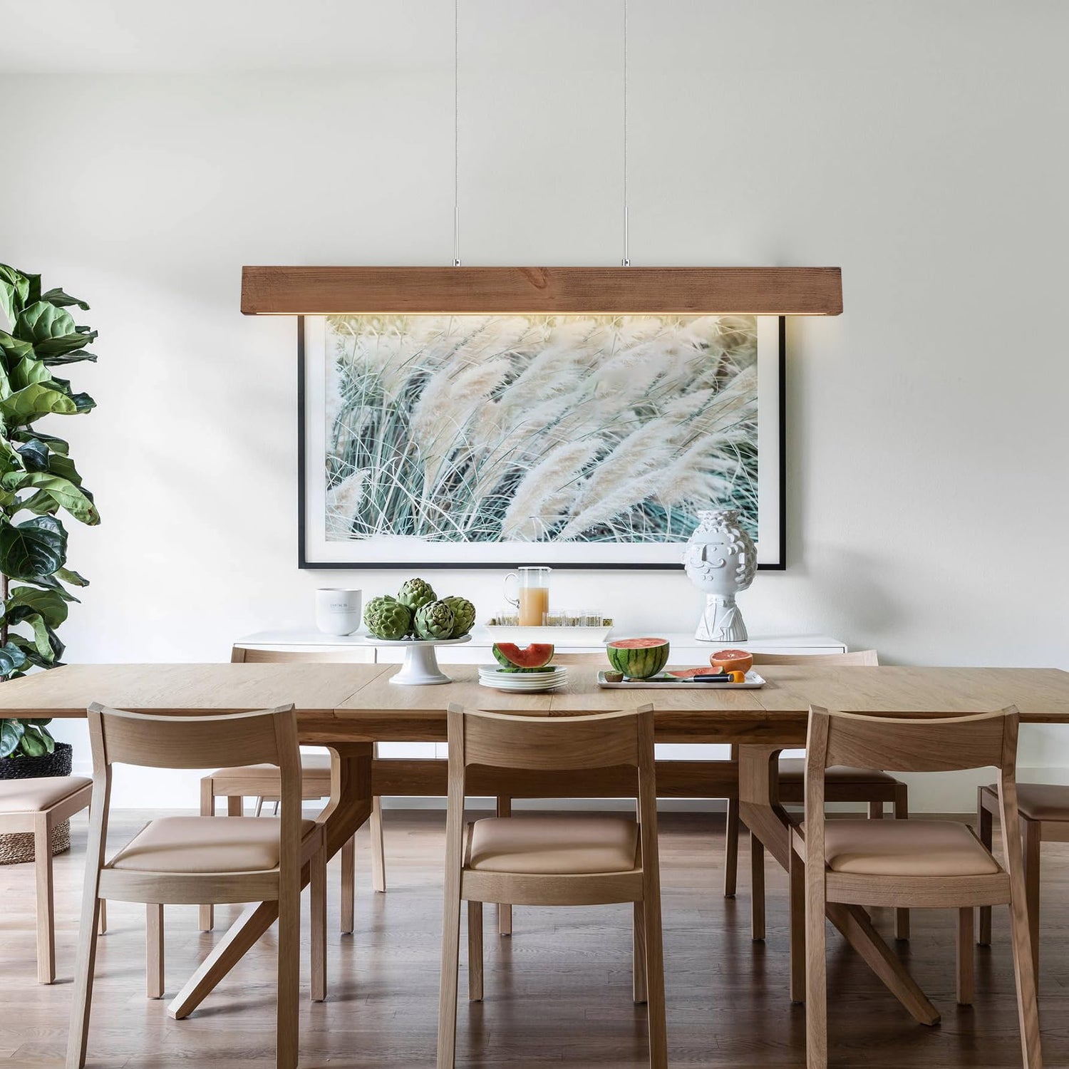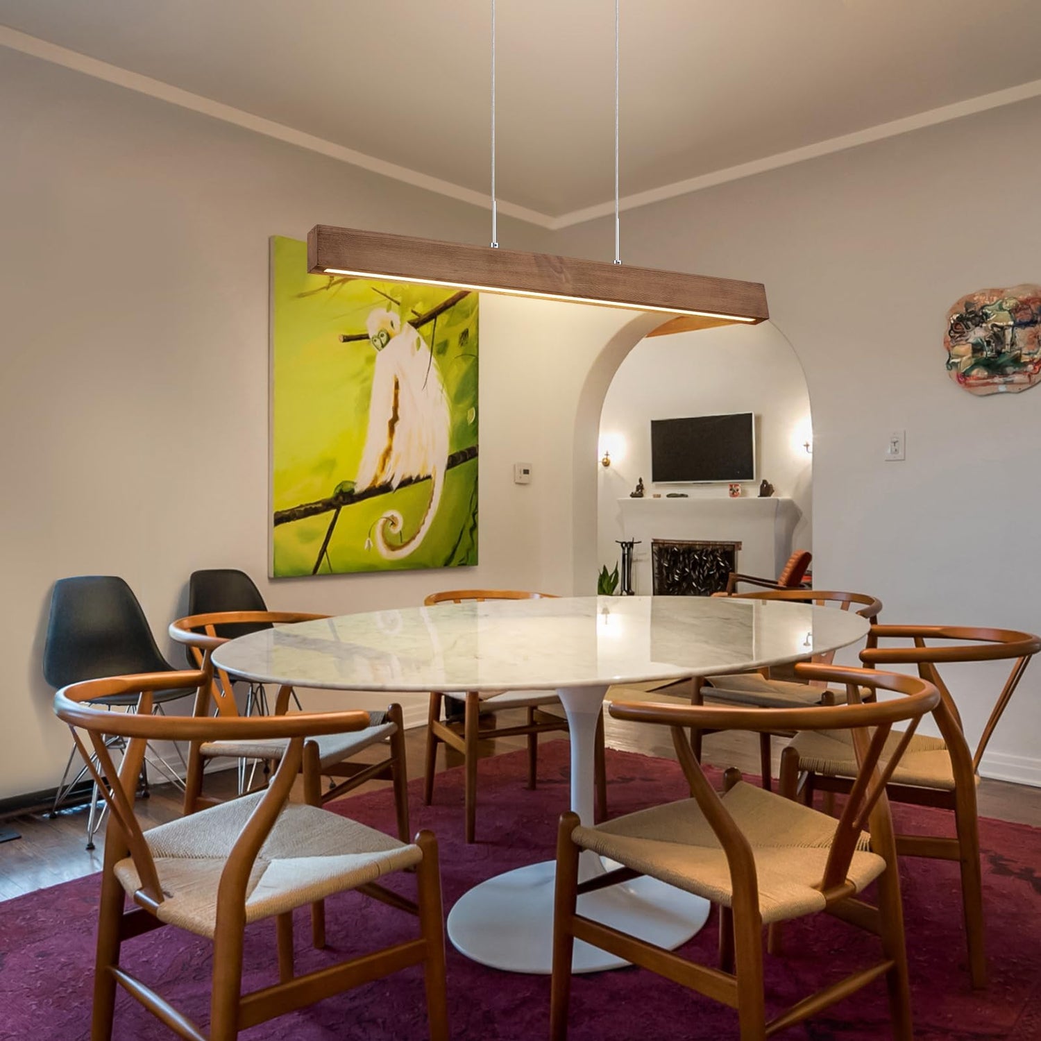 - Unique DESIGN -- This wood LED pendant light is composed of linear Wood and LED with pendant lights, which is very generous and fashionable. The linear design offers clean lines and a minimalist appeal, perfect for both residential and commercial settings.When you place it on your kitchen or dinning room,you will feel warm and comfortable light arroud you.