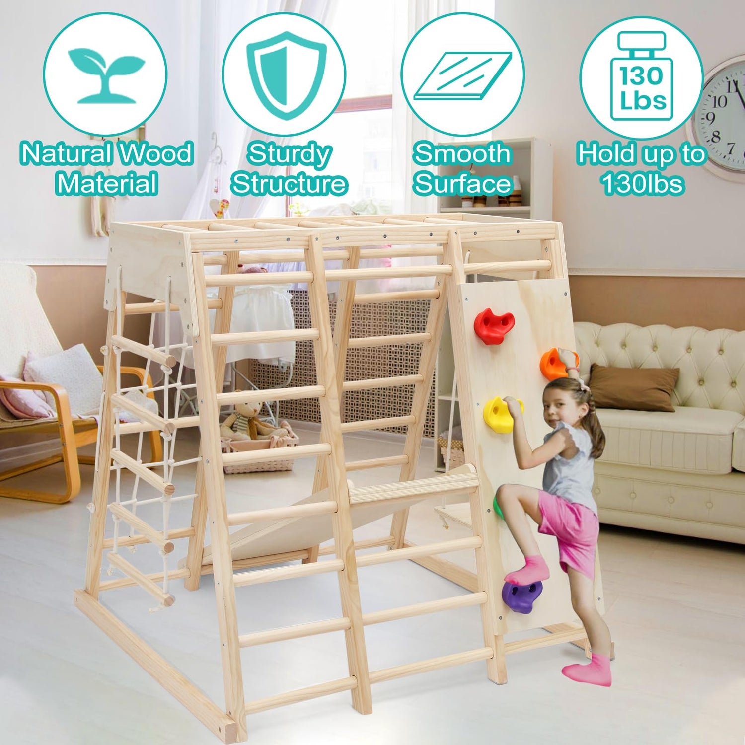 • 【Natural Wood Material】Crafted from natural pine wood, our indoor jungle gym stands out for its robust durability and eco-friendliness compared to plastic alternatives, offering a non-toxic, harmless environment for children's play. The wood's smooth finish and strong structural integrity ensure a safe playing surface, free from sharp edges or hazardous materials. While this playset is designed with child safety in mind, we still recommend parental supervision to enhance the play experience