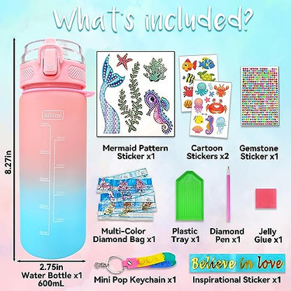 Details: PACKAGE INCLUDE: 600mL Water Bottle x1, Mermaid Pattern Sticker x1, Gemstone Sticker x1, Cartoon Stickers x2, Inspirational Sticker x1, Multi-Color Diamond Bag x1, Diamond Pen x1, Plastic Tray x1, Jelly Glue x1, Mini Pop Key chain x1.