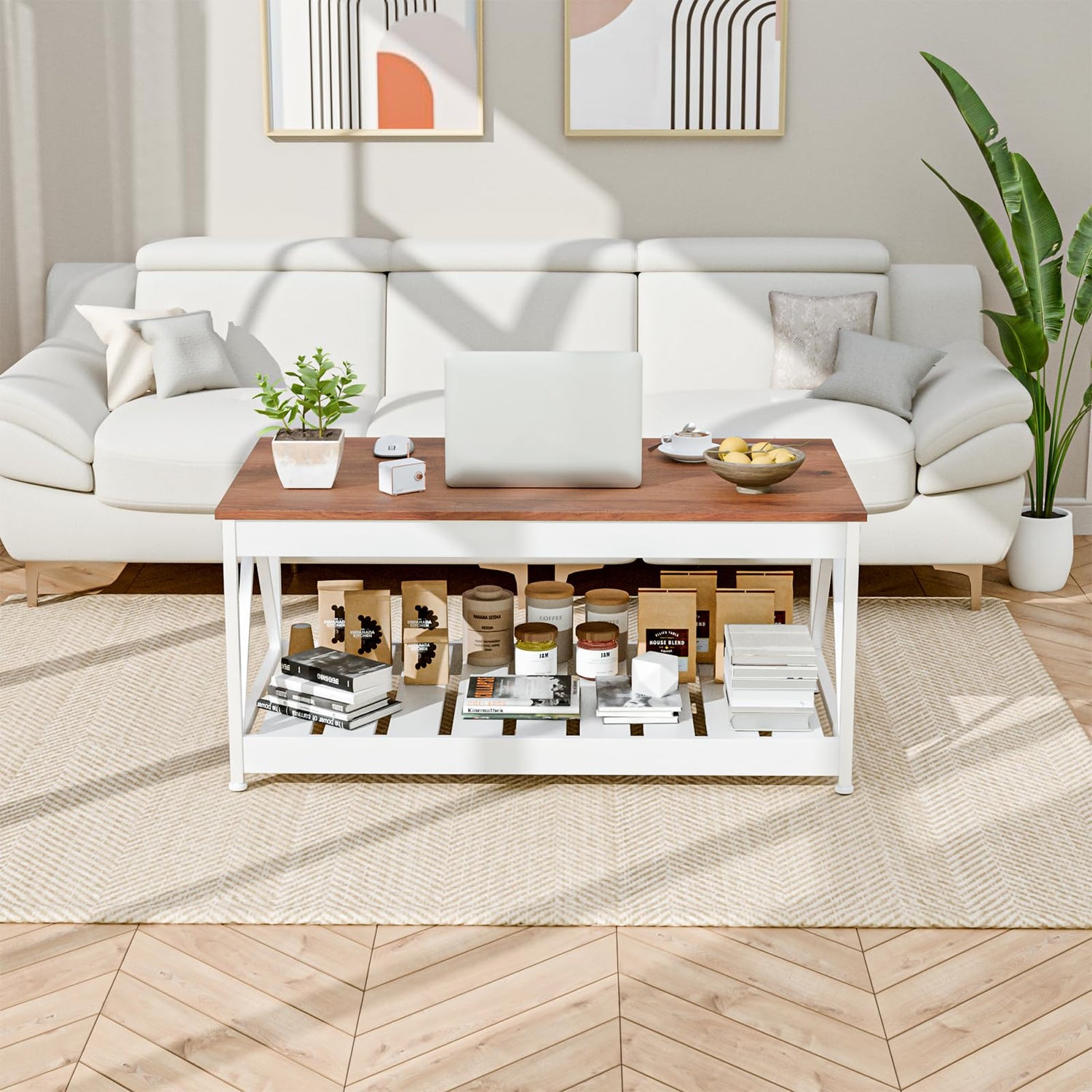 EDWINENE 39.4 Inches White Coffee Table for Living Room, Farmhouse Coffee Table with Storage Shelf
