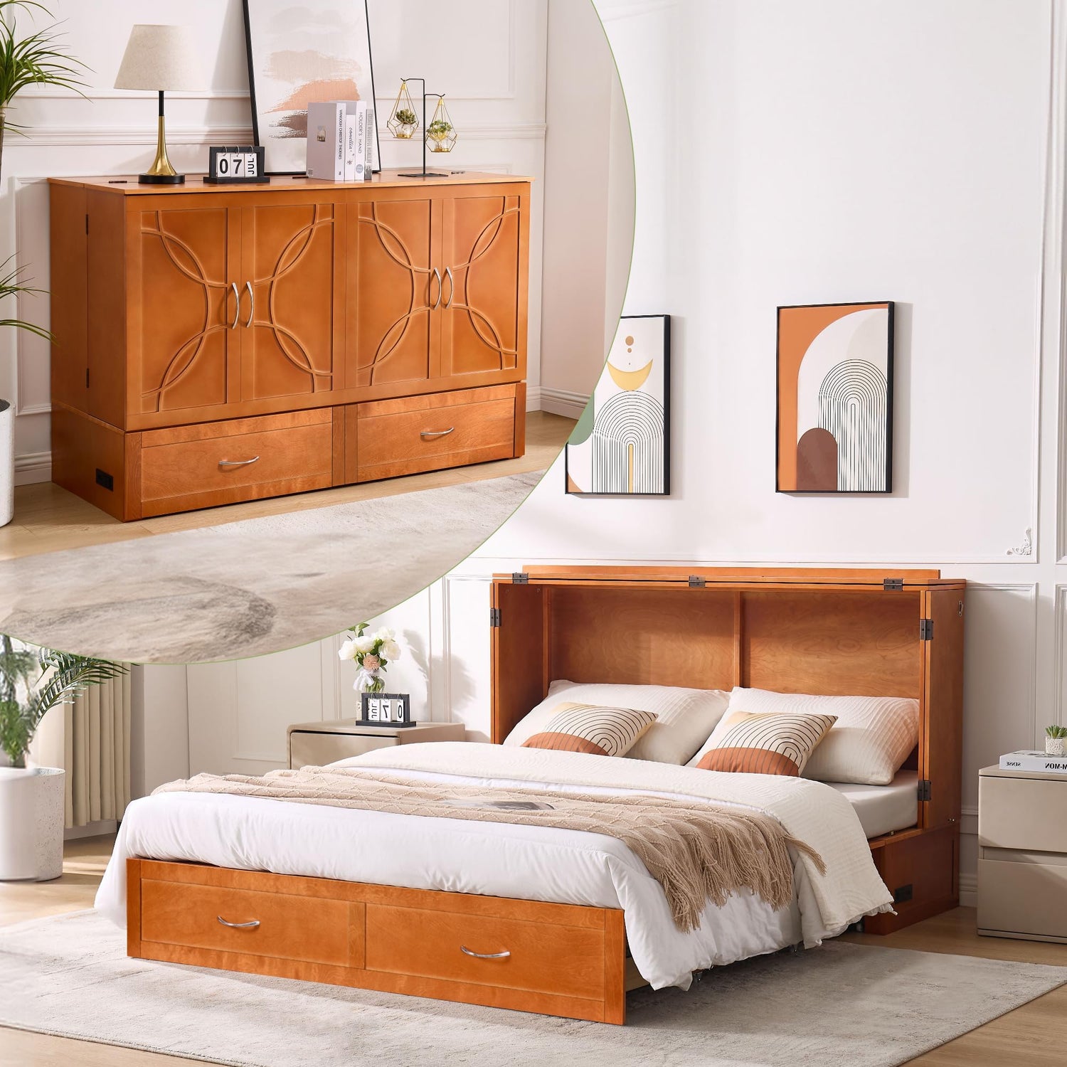 EDWINENE Queen Murphy Bed with Mattress Included, Murphy Bed Cabinet with Drawers and Charging Station for Small Spaces, Home Offices (Circular Pattern, Cherry)