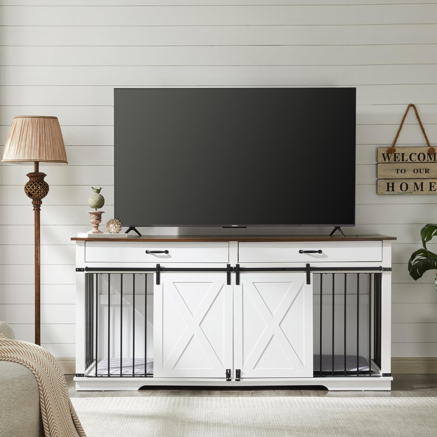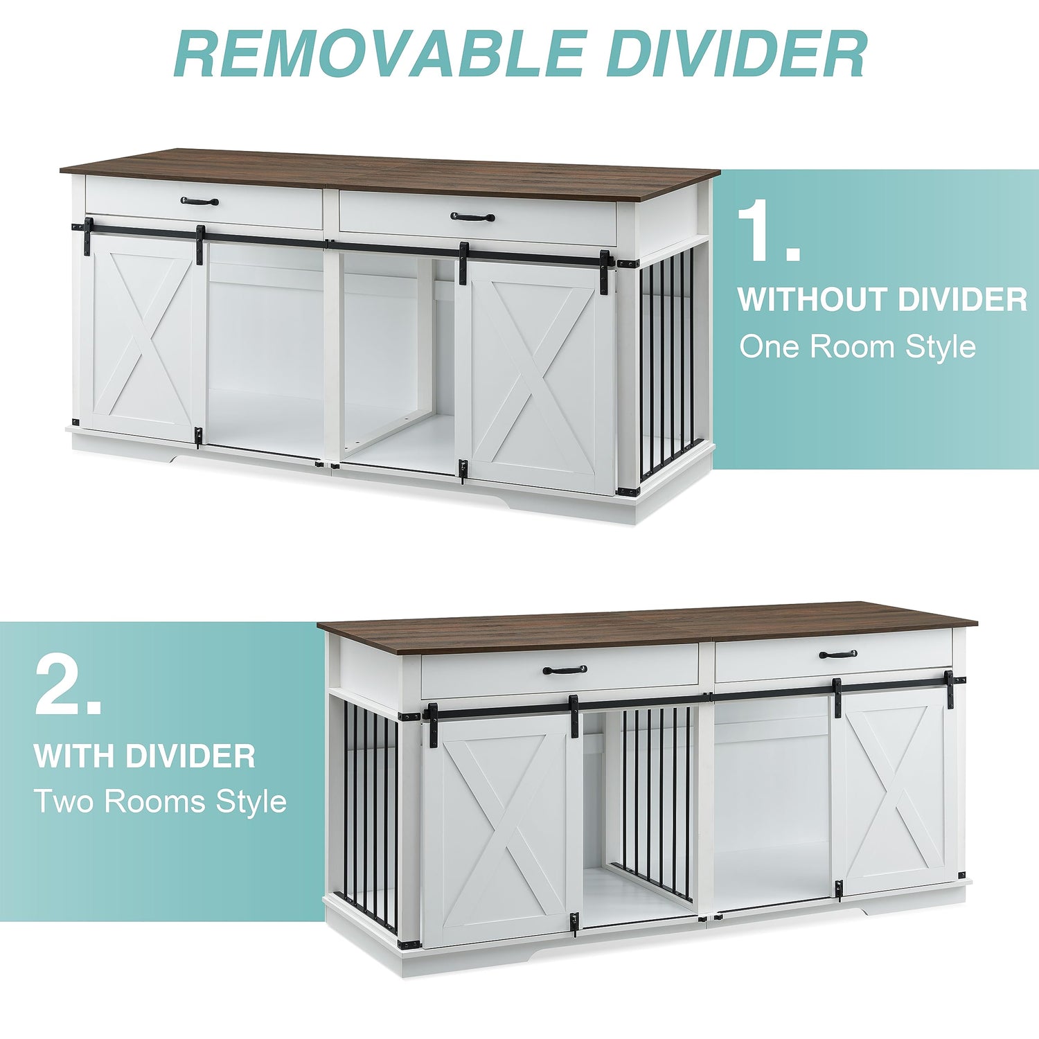 - 【FARMHOUSE FURNITURE STYLE DOUBLE DOG CRATES】Overall Size: 72.5"L x 23.6"W x 34.3"H. Featuring barn doors, farmhouse and bracket decor, the dog crate furniture is both modern and casual feel. Minimalist design blends easily with existing interiors wherever it is placed.