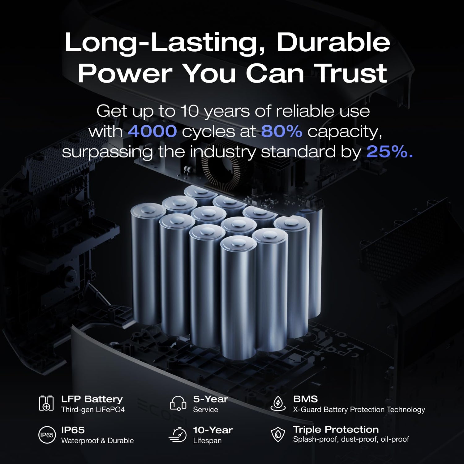 - Durable and Reliable for 10 Years. Powered by LiFePO4 (LFP) cells, with 4000 cycles to 80%, offering 25% more durability than industry standards. Enjoy a 10-year lifespan for daily use. The IP65 battery pack provides triple protection: splash-proof, dust-proof, and oil-proof.