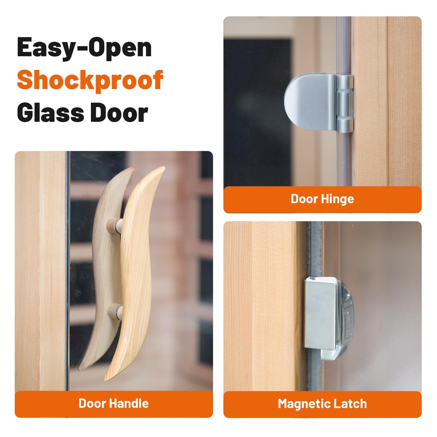 • 【High-Quality Materials】Our home infrared sauna is crafted from premium Canadian hemlock wood and features a durable tempered glass door. Each panel is clearly marked for easy identification and quick assembly, ensuring a seamless setup experience. This wood sauna is perfect for any indoor space, providing a luxurious sauna experience.