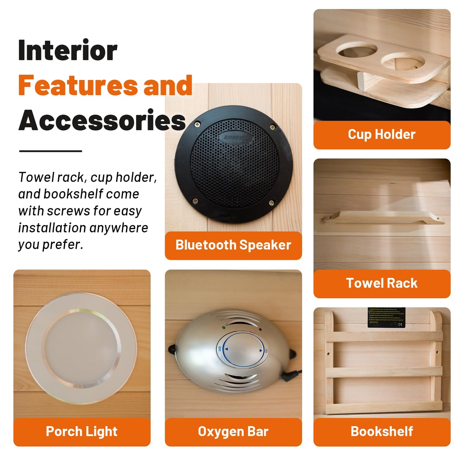 - 【Smart Entertainment】Enhance your relaxation in our home sauna infrared with a sauna backrest and reading lights,MP3 and Bluetooth connectivity, and convenient accessories like cup holders, magazine racks, and towel racks. Customize the placement of these accessories to suit your personal preferences, making your indoor sauna experience even more enjoyable.