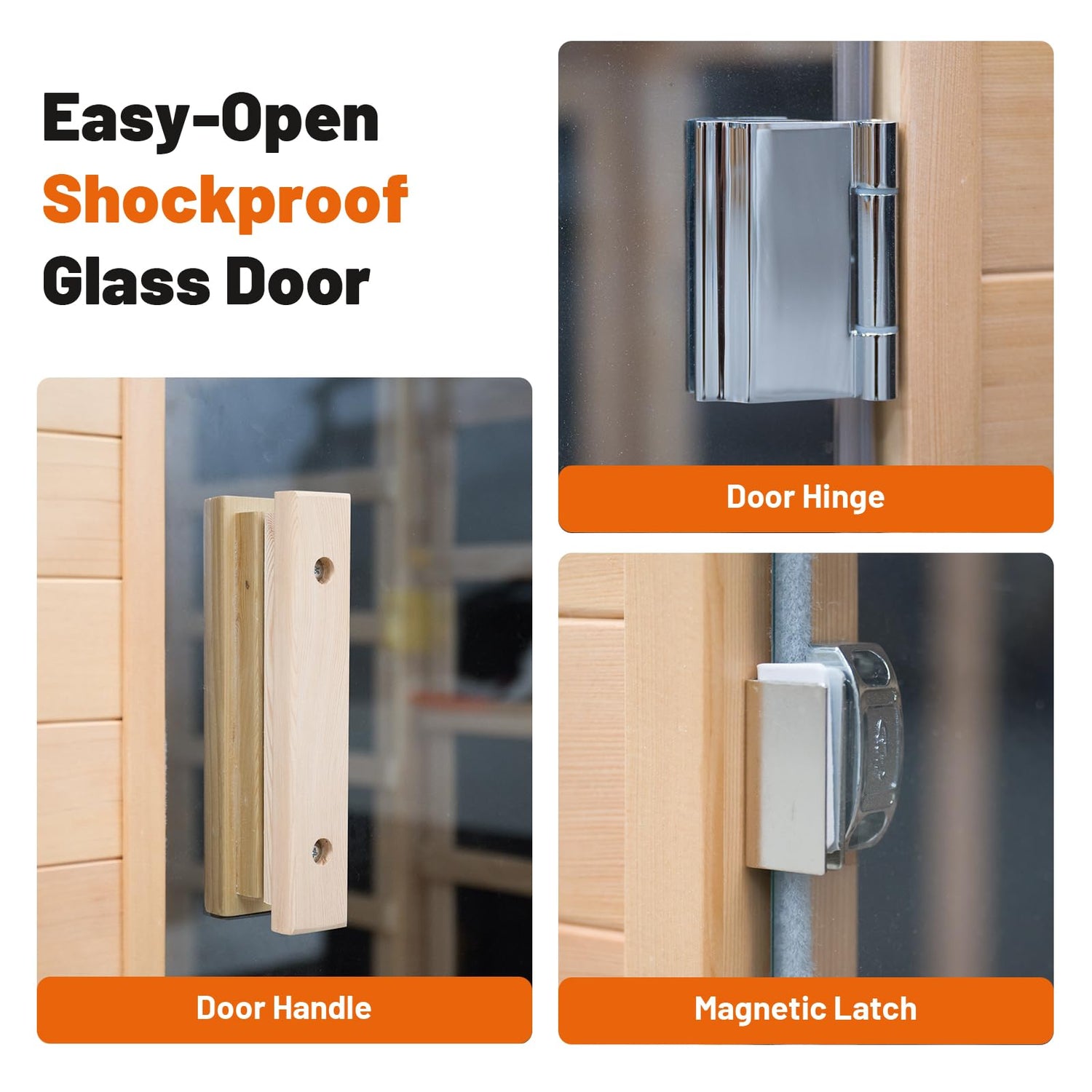 - 【High-Quality Materials】Our home infrared sauna is crafted from premium Canadian hemlock wood and features a durable tempered glass door. Each panel is clearly marked for easy identification and quick assembly, ensuring a seamless setup experience. This wood sauna is perfect for any indoor space, providing a luxurious sauna experience.