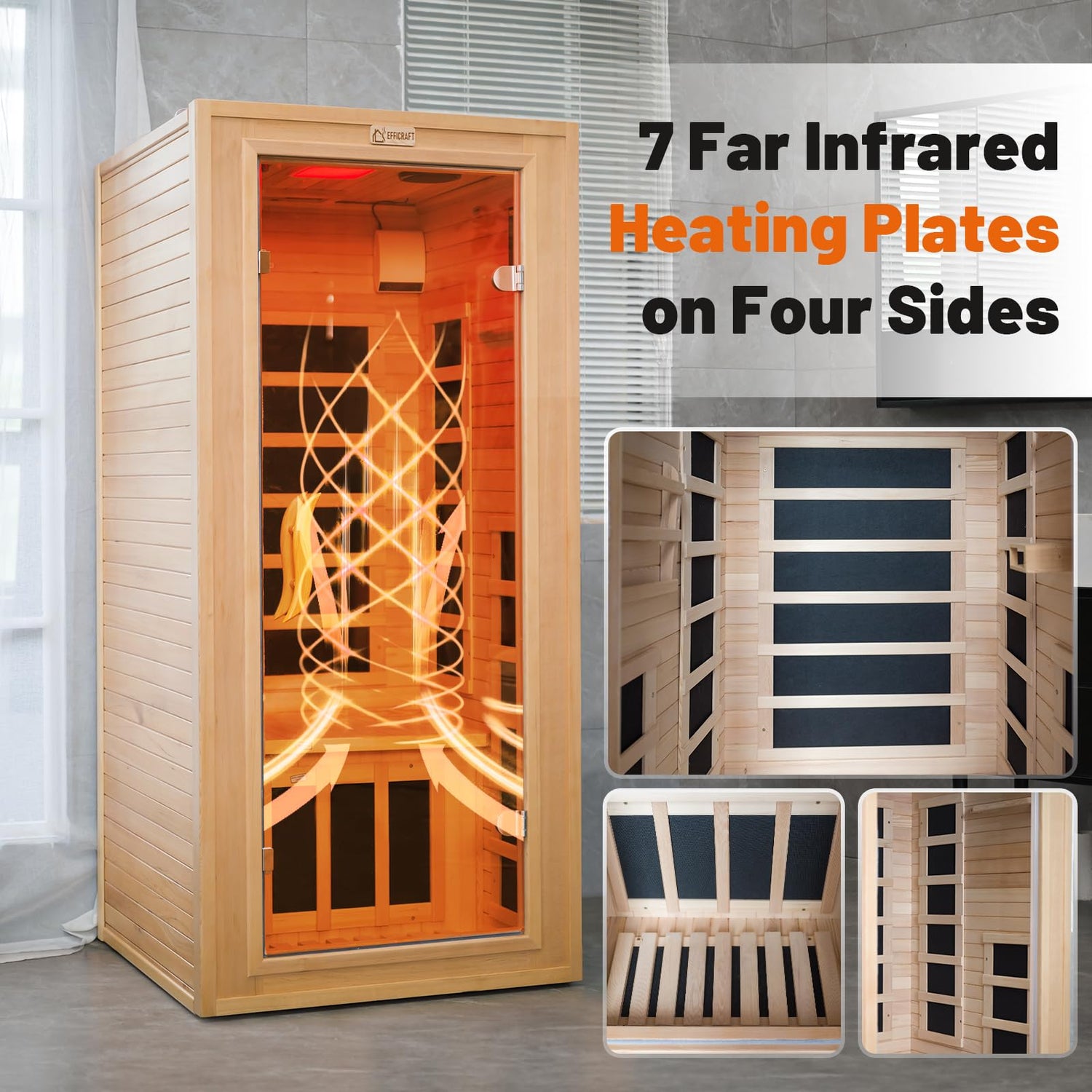 Efficraft Infrared Sauna Indoor, 1 Person Hemlock Wooden Home Sauna, Dry Sauna for Home Spa Room 1350W, Time Temp Pre-Set Sauna Room, w/7 Heating Panels Mini Personal Far Infrared Saunas for Home
