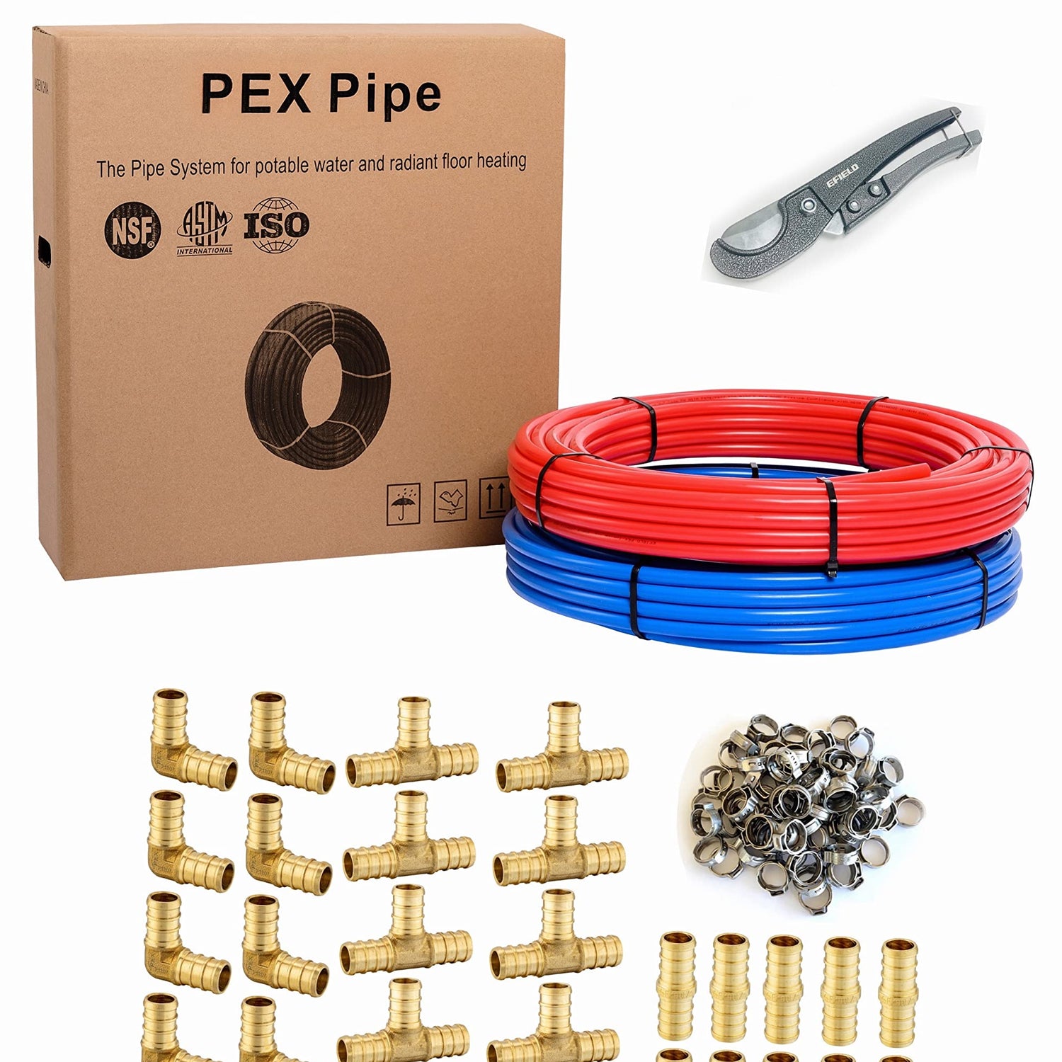EFIELD 1/2 Inch 2 x 100 ft (200 Ft) Pex-b Pipe/Tubing, 30 Pcs 1/2-inch Barb Crimp Brass Fittings, 100 Pcs Stainless Steel Cinch Clamps, Pipe Cutter