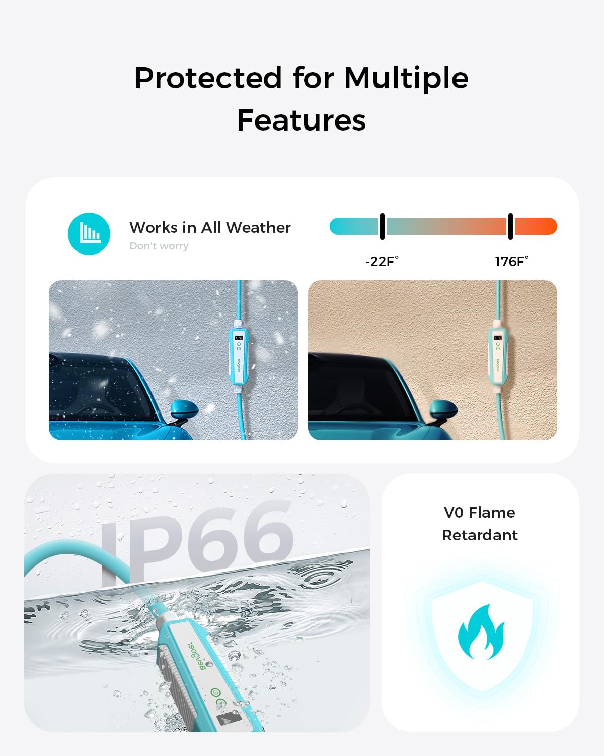 - 【IP66 WATERPROOF AND PORTABLE CHARGING】The 32A EV charger is waterproof and dustproof (IP66) for reliable use in all weather conditions, whether it's rainy, snowy, or hot, both indoors and outdoors. It comes with a 110-volt charging cable and a custom protective case for safe storage in your vehicle, so you can recharge your EV anywhere—whether you're on a business trip, visiting family and friends, or traveling. With a 20 FT cable length from plug to charging gun, it gives you the flexibility to park your car wherever you need.