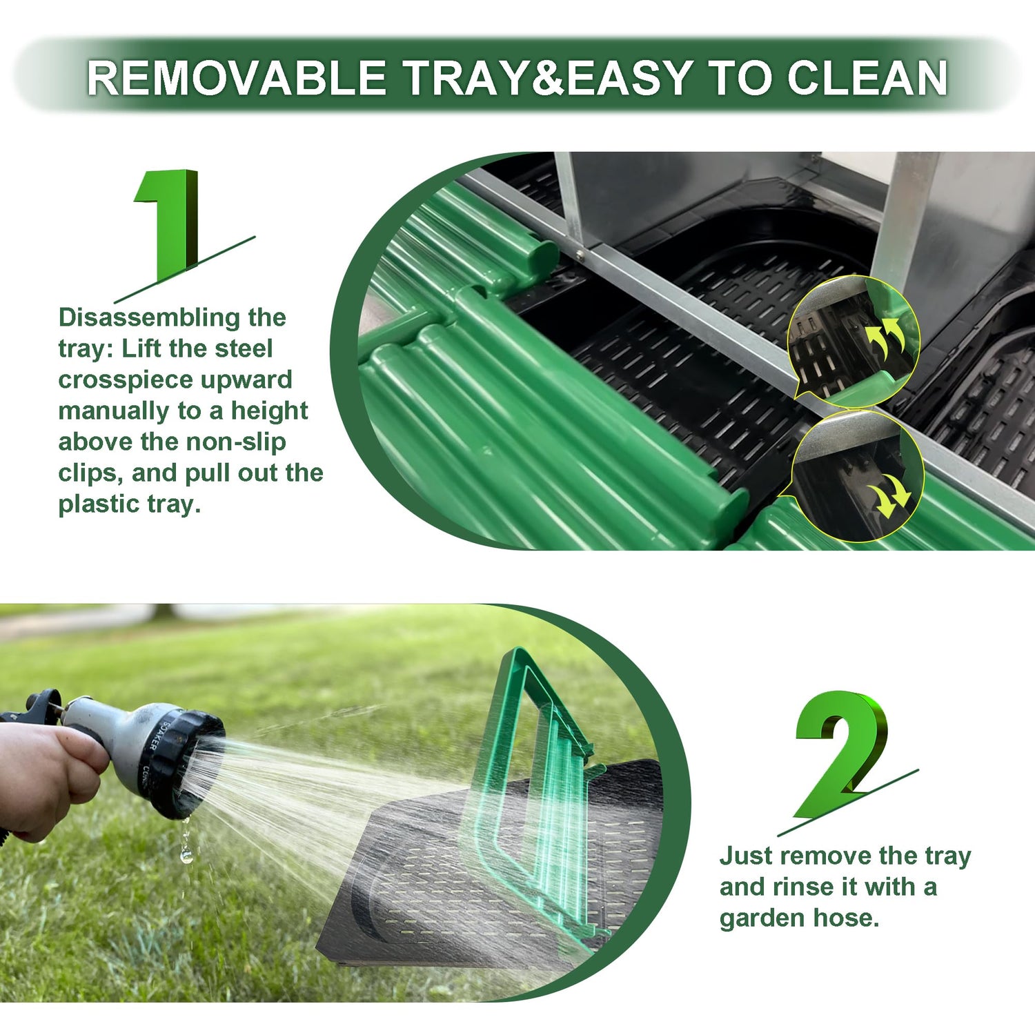 - DESIGNED FOR LASTING: The side and roof are made with galvanized steel for strong construction, with ventilation holes to provide fresh air for hens and keeps the nesting box dry and cool. The trays are made with plastic that won’t rust and are easy to clean