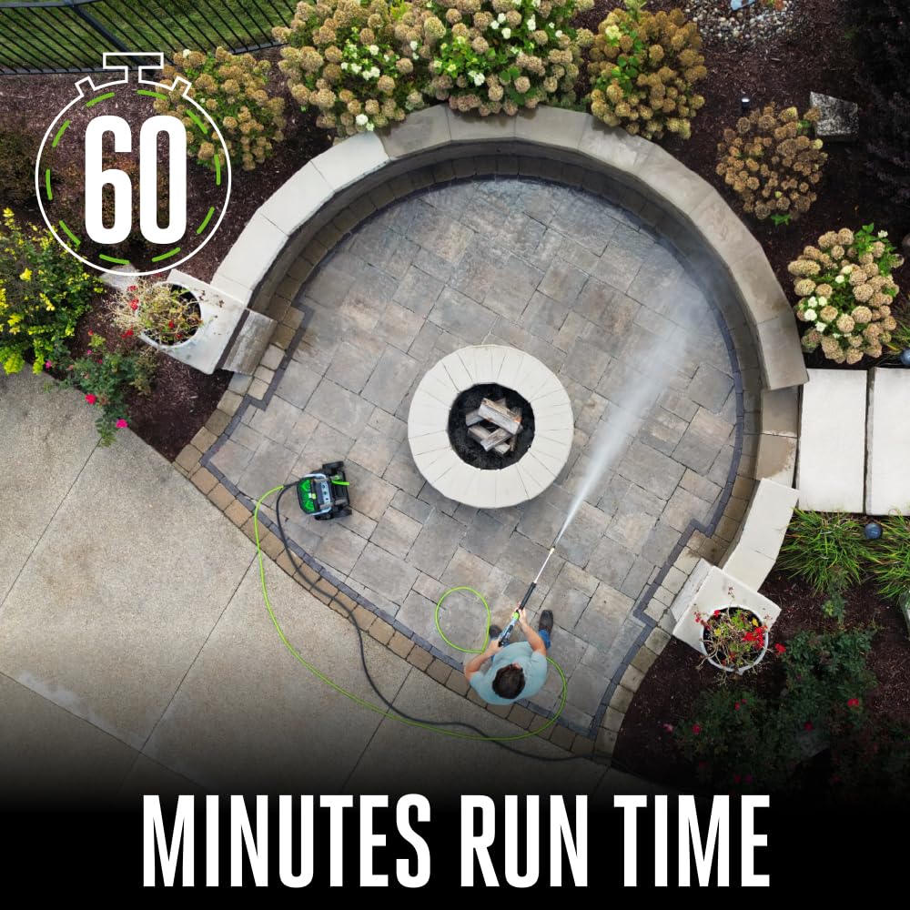 Details: The EGO POWER+ 3200 PSI Pressure Washer is the industry’s most powerful cordless pressure washer (based on 2023 Chervon testing on Turbo mode). Featuring Peak Power™ technology, this cordless electric pressure washer combines the power of any two EGO POWER+ 56V ARC Lithium™ batteries to deliver up to 3200 PSI at 1.2 GPM—and up to 2.0 GPM max—for powerful and efficient cleaning. It delivers up to 60 minutes of runtime on a single charge with two included 6.0Ah ARC Lithium™ batteries. Handheld pressure control allows you to select ECO, High, and Turbo modes as well as view battery charge status via the display integrated into the wand. Quick-connection points for hoses and the wand allow easy setup, breakdown, and nozzle changes. A telescopic handle pulls out for easy transport and collapses for compact storage. The power washer comes with a flexible 25-foot high-pressure hose, siphon hose, 15-degree nozzle, 25-degree nozzle, 40-degree nozzle, turbo nozzle, rinse nozzle, quick-connect short pressure washer gun, quick-connect wand lance, stainless steel wand, foam cannon, and filter. The portable pressure washer can draw from a fresh water source like a bucket when used with the included siphon hose. Clean with Power Beyond Belief™ with the EGO POWER+ 3200 PSI Pressure Washer.