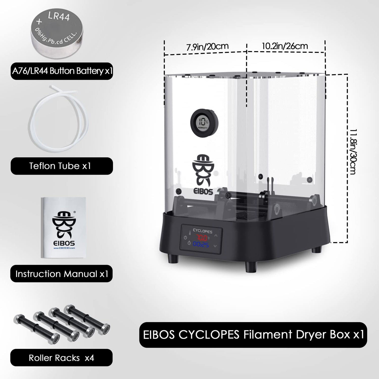 - 【LOW NOISE & CUSTOMER SERVICE】eibos cyclopes has upgraded its PCB board with the newest relay for better performance, aimed at minimizing any noise while the dryer operating, NO clicks on and off sound at all, the batch from Nov 2023 applies. ❤️🔥The dryer is designed to reduce humidity levels to 10%, if the humidity indicator does not display accurately, please contact us for Humidity Sensor Support❤️🔥Besides, 1-Year After-Sales Guarantee offered for your peace of mind