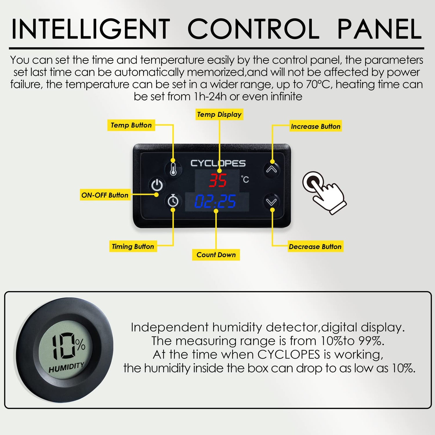 ·The heating time can be set based on your requirement,the countdown setup is from 0h to 24 hours and the shutdown is accurate to minute. You can set unlimited heating as well. In this setting,CYCLOPES is in the normally open state.The parameters set last time can be automatically memorized,and will not be affected by power failure.