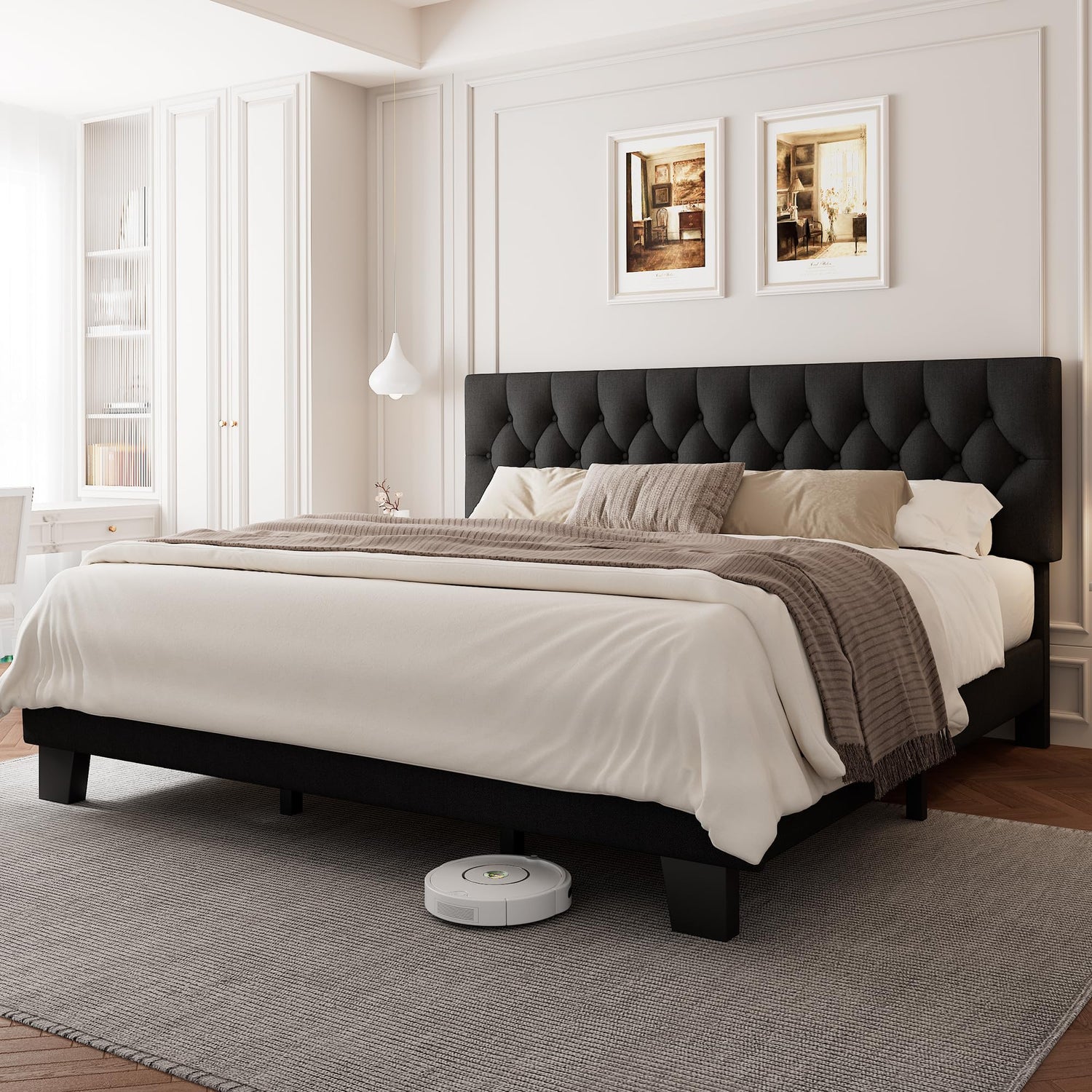 Einhomn King Upholstered Bed Frame with Headboard, Button Tufted Linen Bed Base, Platform Bed with Heavy Duty Wood Slat Support, Noise Free, No Box Spring Needed, Easy Assembly, Black