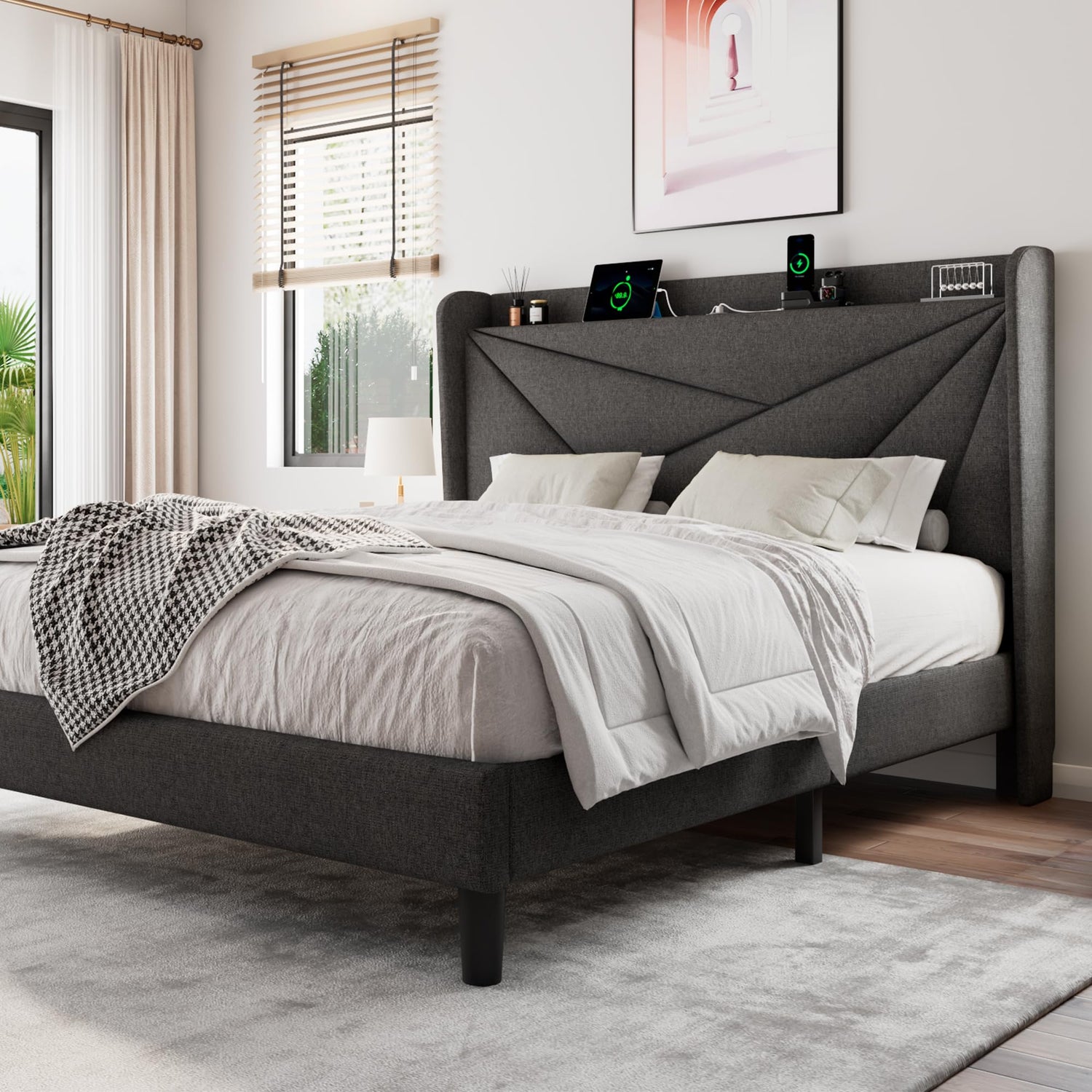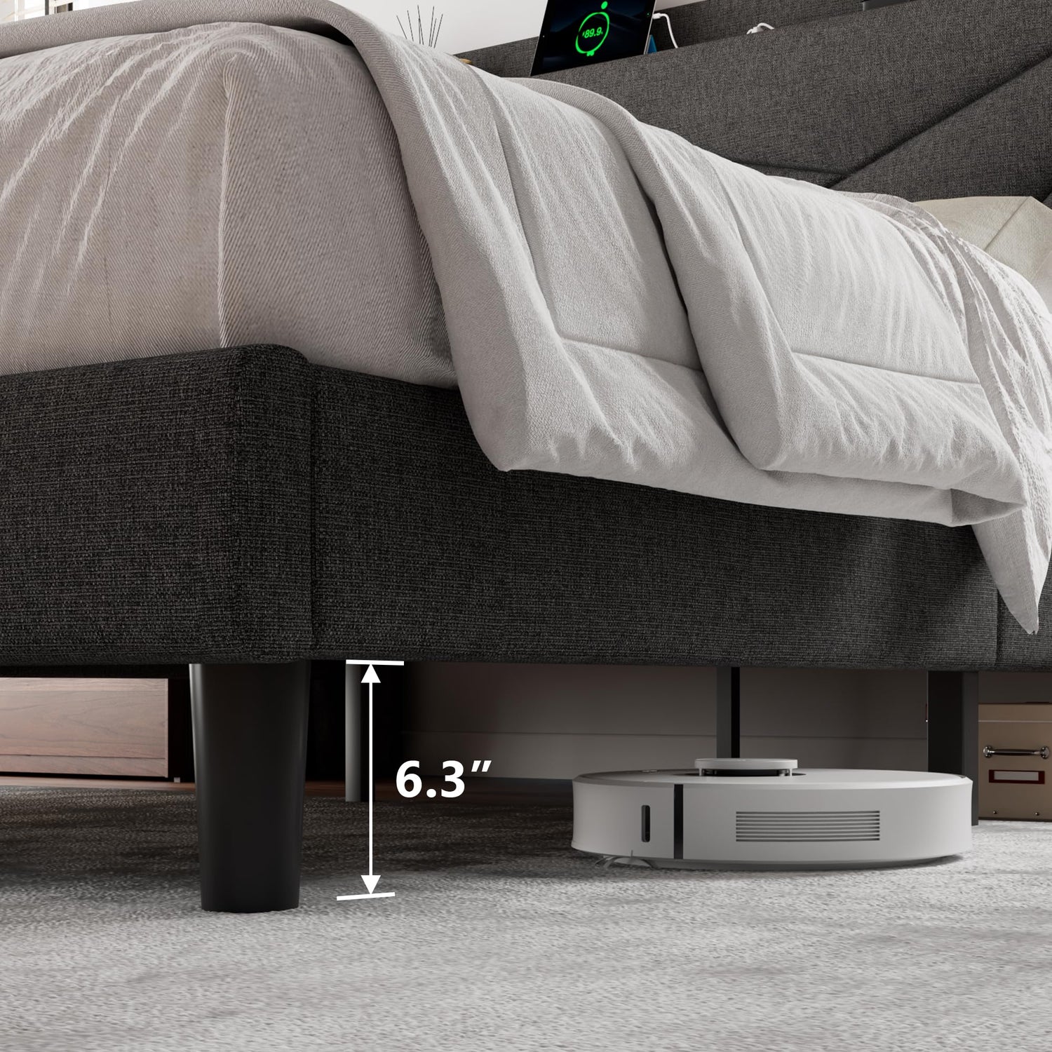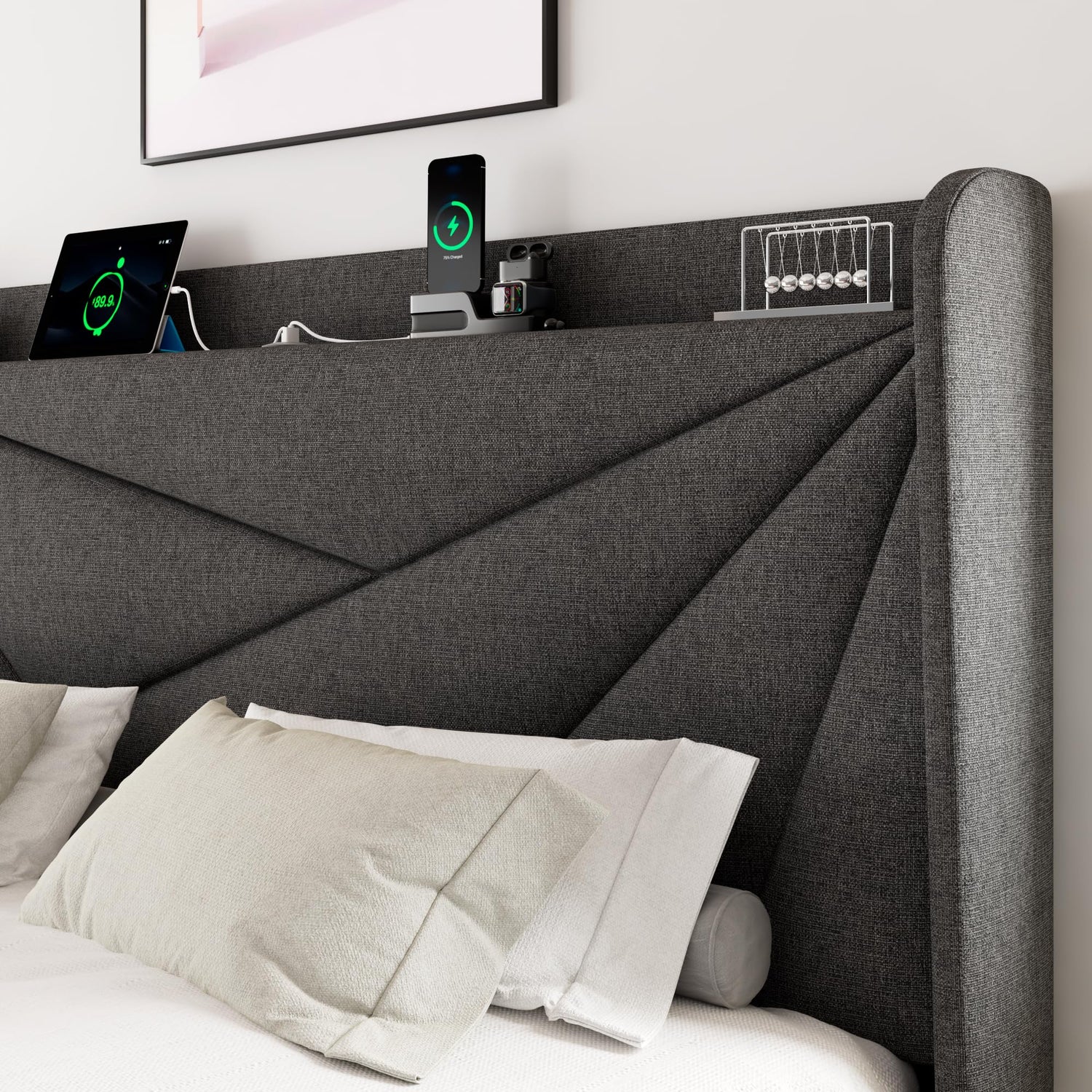 Einhomn Dark Grey Queen Size Upholstered Bed Frame with Built-in Charging Station and Storage Headboard