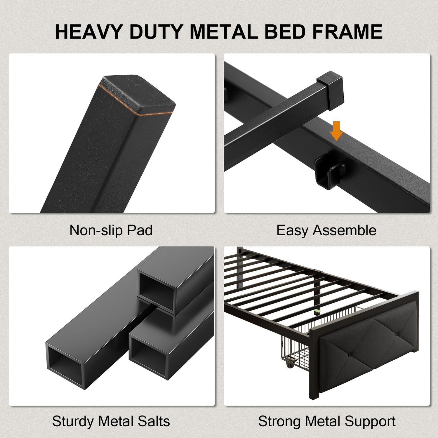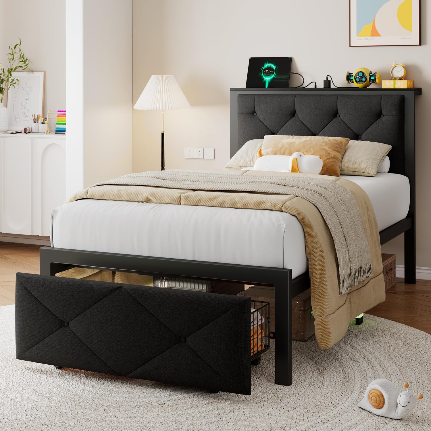 Einhomn Twin Bed Frame with Storage Drawer, Metal Platform Bed with Charging Station, Upholstered Button Tufted Storage Headboard, No Box Spring Needed, Noise-Free, Easy Assembly, Black