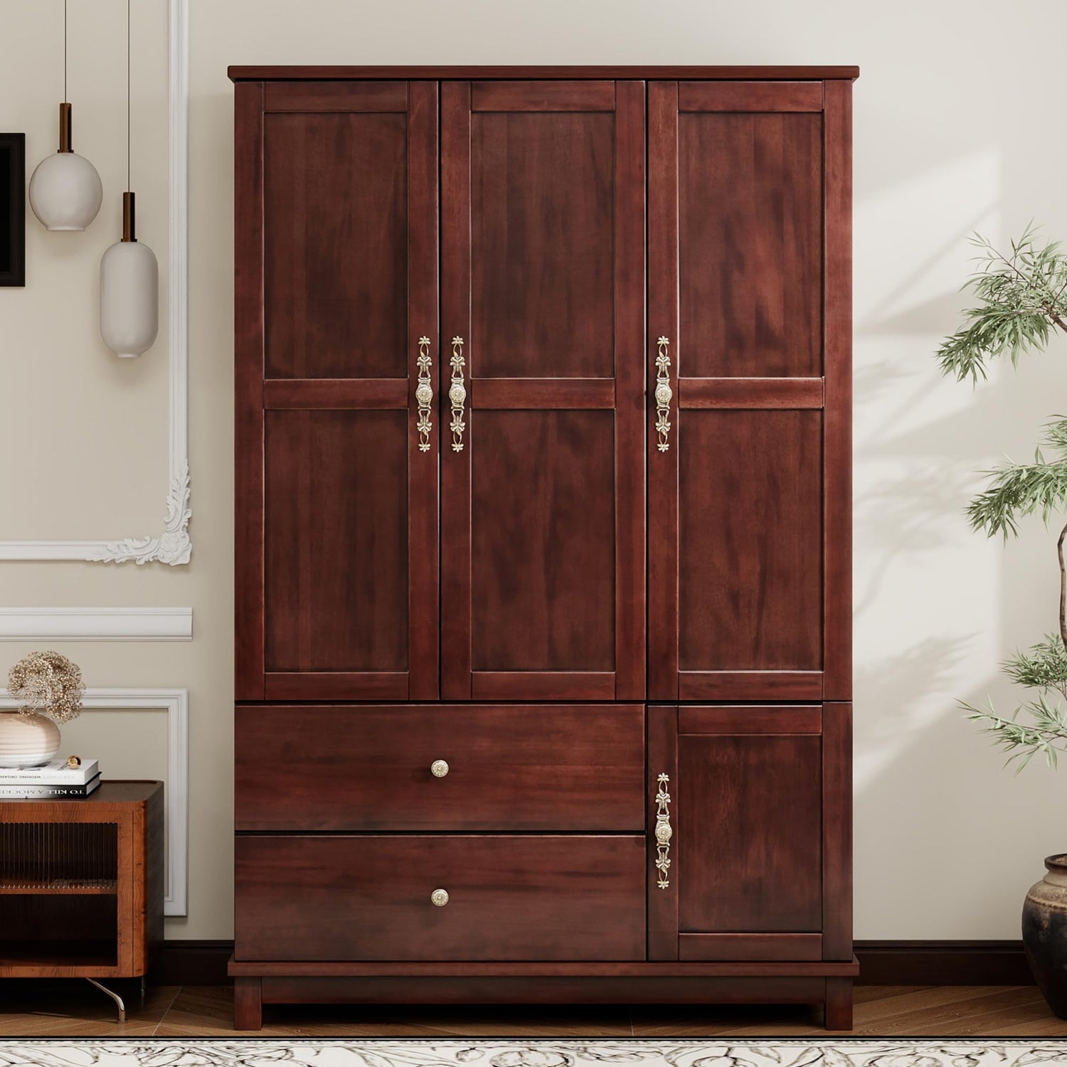 EITACHUL Solid Wood Brown Armoire Wardrobe Closet: 3 Door Solid Wood Wardrobe Cabinet with 2 Drawers, Armoire Closet with Hanging Rods Storing Clothes for Bedroom