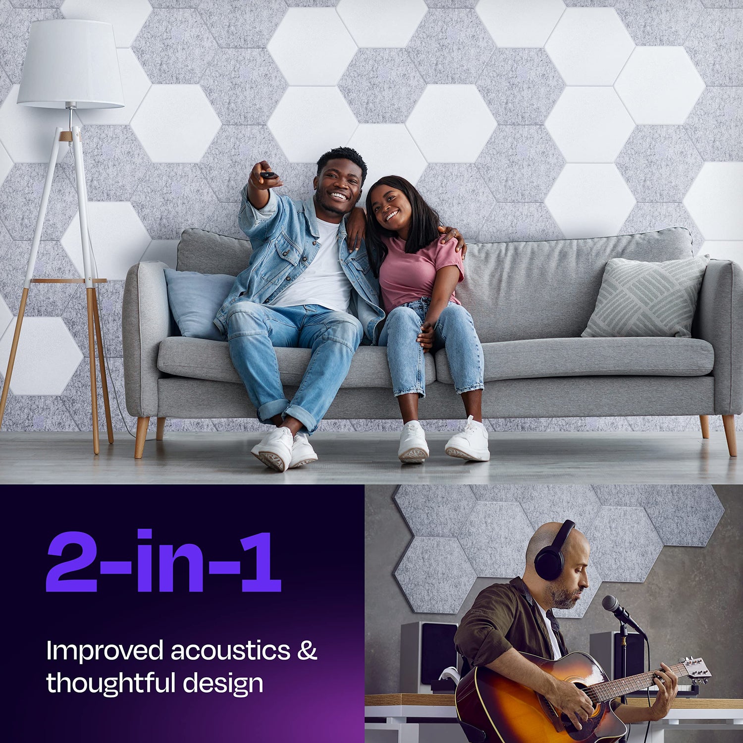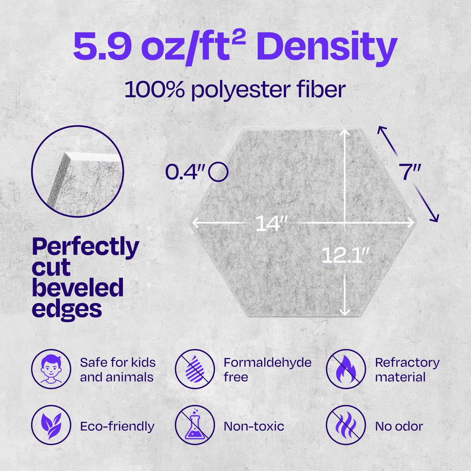 - 【SUPERIOR NOISE REDUCTION PANELS】: Each soundproofing panel is precisely cut of high-density, 5.9oz/ft^2 (1800gr/m^2) poly-fiber panels. Our sound proofing padding for wall reach a NRC rating of up to 0.95, making a big difference to the sounds we hear around us. Pick these hexagon acoustic panels over the old acoustic foam panels and create a beautiful room with superior sound quality.