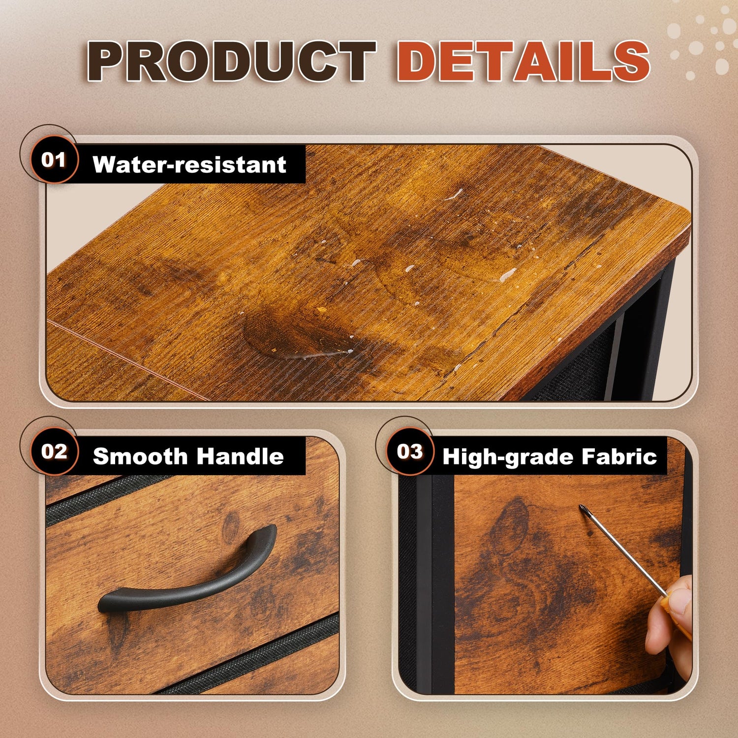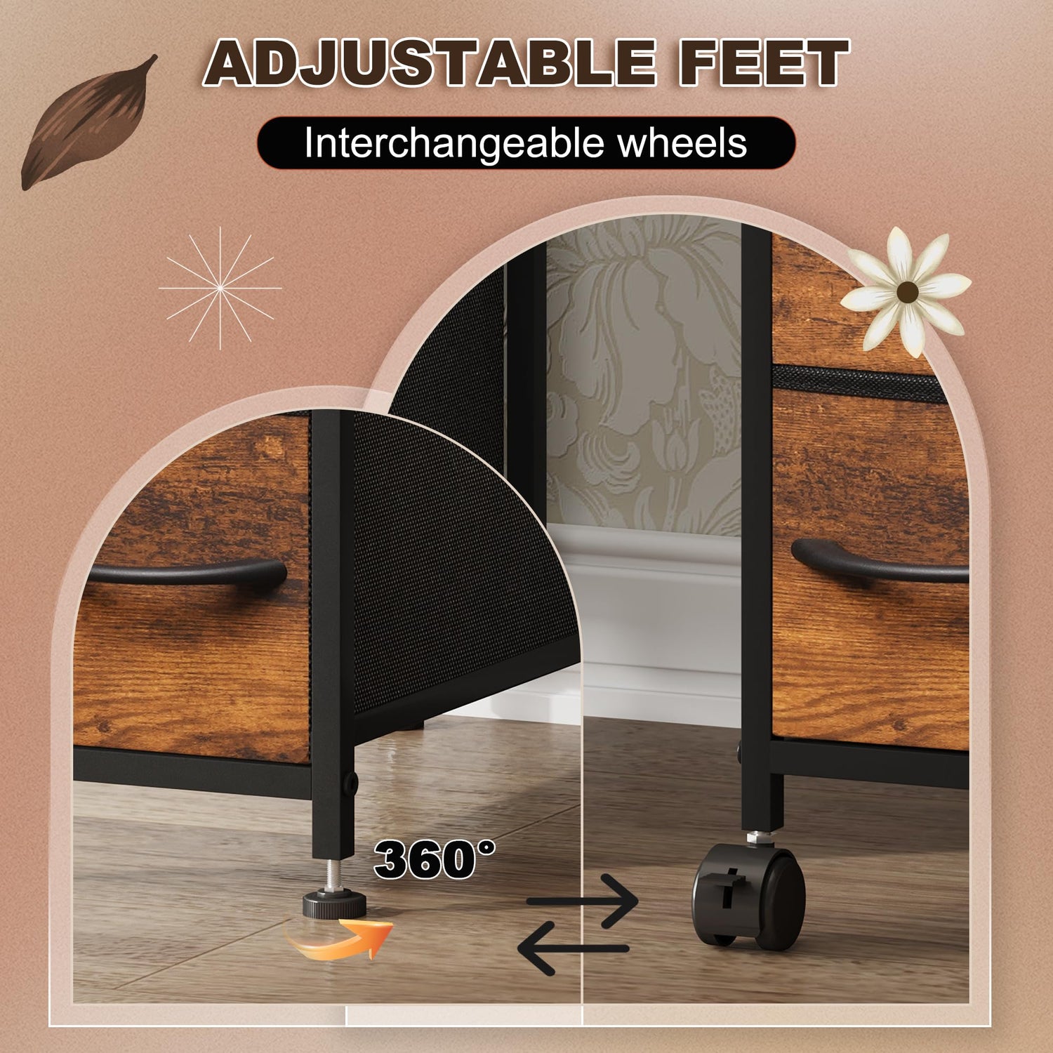 Crafted with a sturdy steel frame and an elegant rustic brown finish, this dresser features four spacious foldable fabric drawers. Each drawer can hold up to 10 lbs, providing ample room for all your daily essentials, from clothing to accessories. The spacious wooden top serves as a convenient surface for everyday items such as books, decor, or a bedside lamp, keeping everything within easy reach.