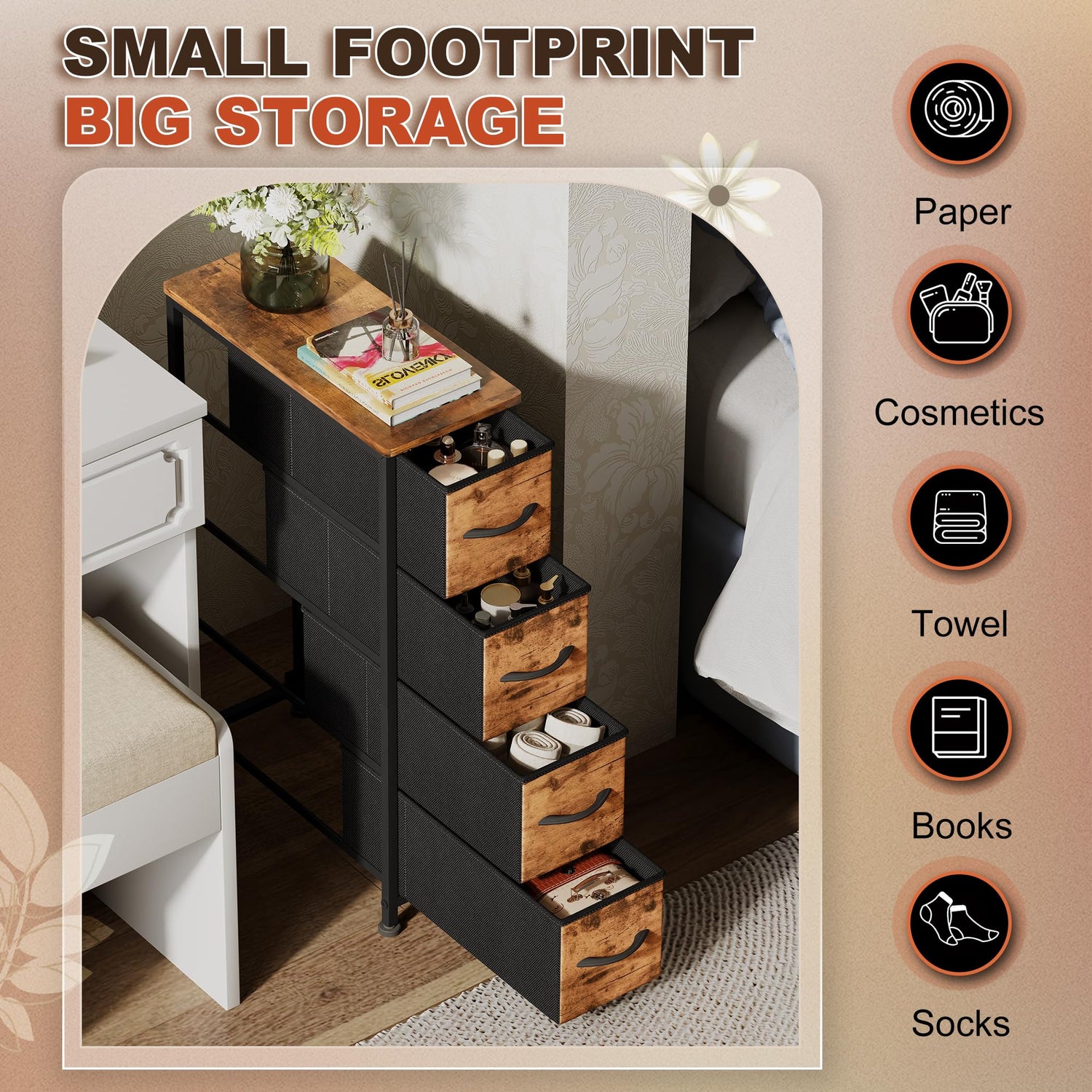 EKNKOZY Rustic Brown Narrow Dresser Tower with 4 Drawers and Steel Frame