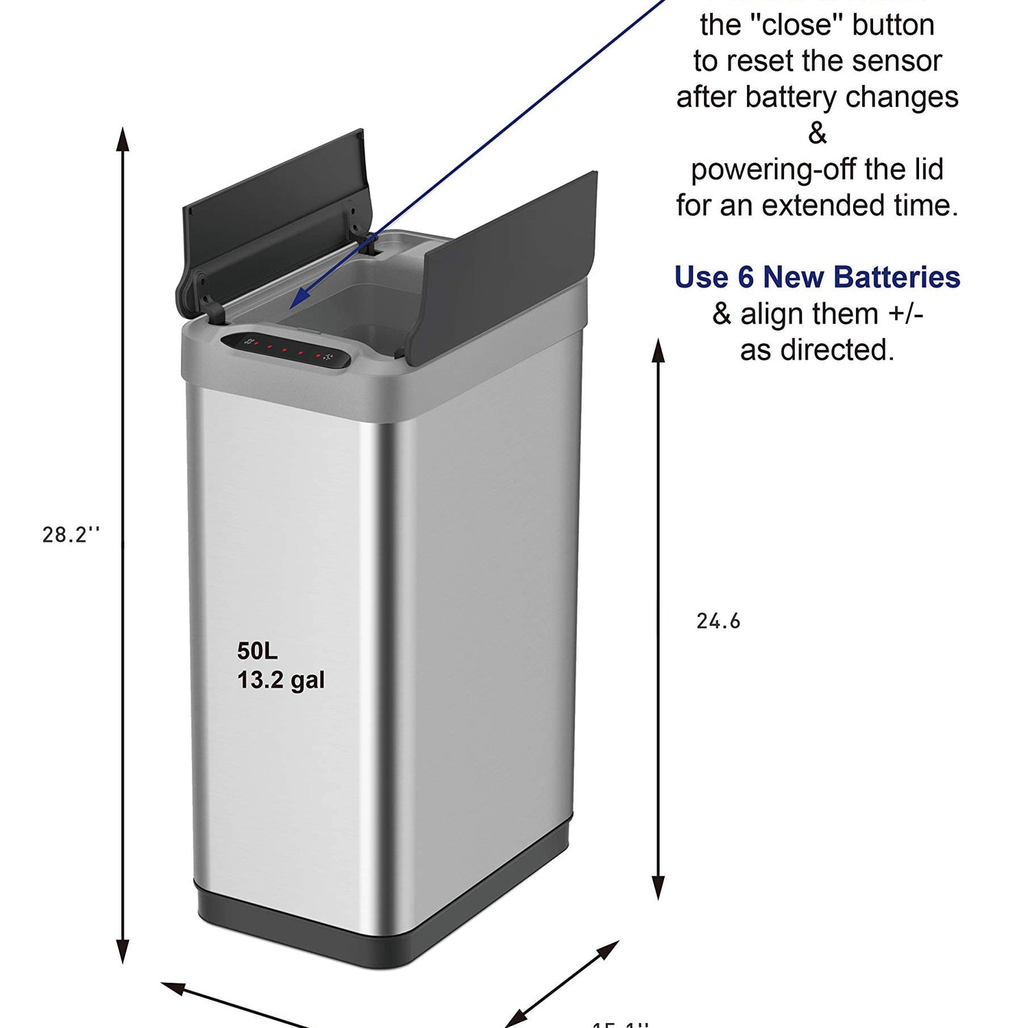 Details: The space-saving vertical design and the dual-wing lid of the PHANTOM T Motion Sensor trash can adds both style and functionality to your home. With its fingerprint resistant stainless-steel finish, it stays looking cleaner longer. Just a wave of a hand the wings open wide enough toss in even the biggest load, yet this design feature requires less height, allowing placement in more places within your home, even under some counters. With just a flip of a switch you can set it to full manual mode when needed. The soft close design provides a quiet, gentle closing. It has a vented plastic base for easy cleaning and odor control. This no-liner version allows for greater trash volume (50L/13. 2G) in a smaller overall size. And it has an intelligent bag system that creates less mess than ever - the removable inner rim secures your disposable trash bag in place and helps conceal it from view. The Phantom T EK9277T sensor trash can allows the benefits of hands-free trash disposal wherever you need it in your home. 50L (13. 2 Gallon) capacity. Requires 6 AA alkaline batteries, not included. Do not use rechargeable batteries. Dimensions: 10.2"W x 15.1"D x 24.6"H. Height with lid open: 28.2"