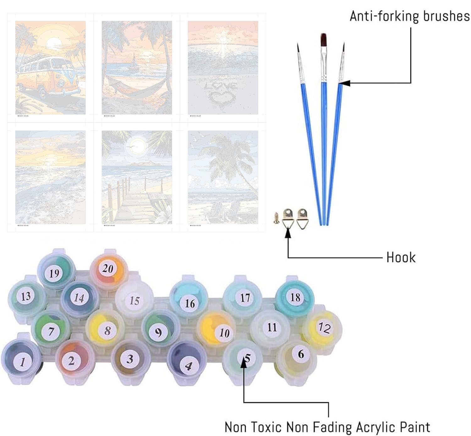 - 【What You Will Get】The paintworks paint by number include 6 pre-printed cotton and linen canvas (without frame), 6 set of high-quality acrylic pigment colors and 6*3 different size brushes.