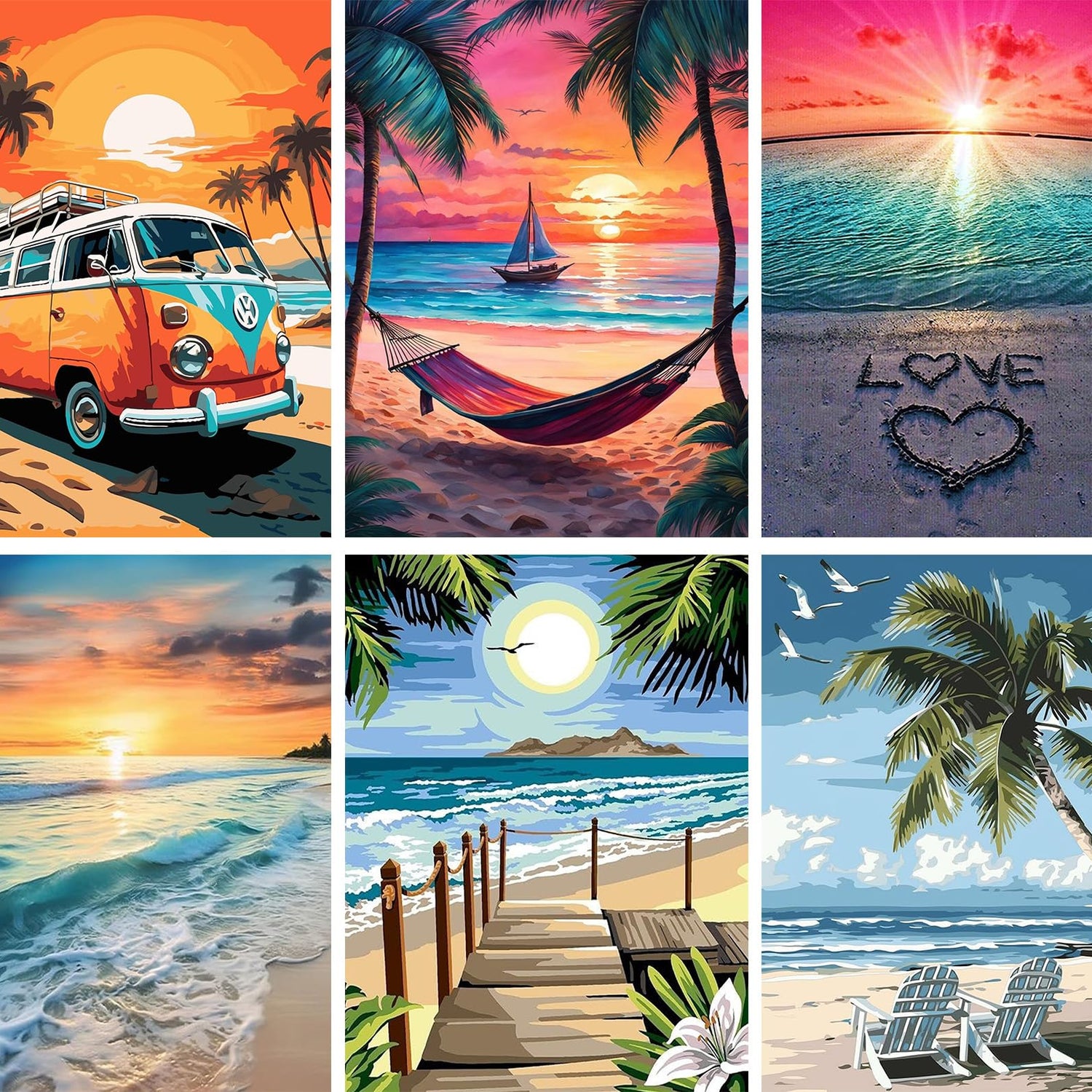 Ekuxom 6 Pack Paint by Numbers Kit for Adults Beginner, 12x16 inch Beach Adult Paint by Number Kits on Canvas, DIY Beach Painting by Numbers for Adults Home Wall Decor