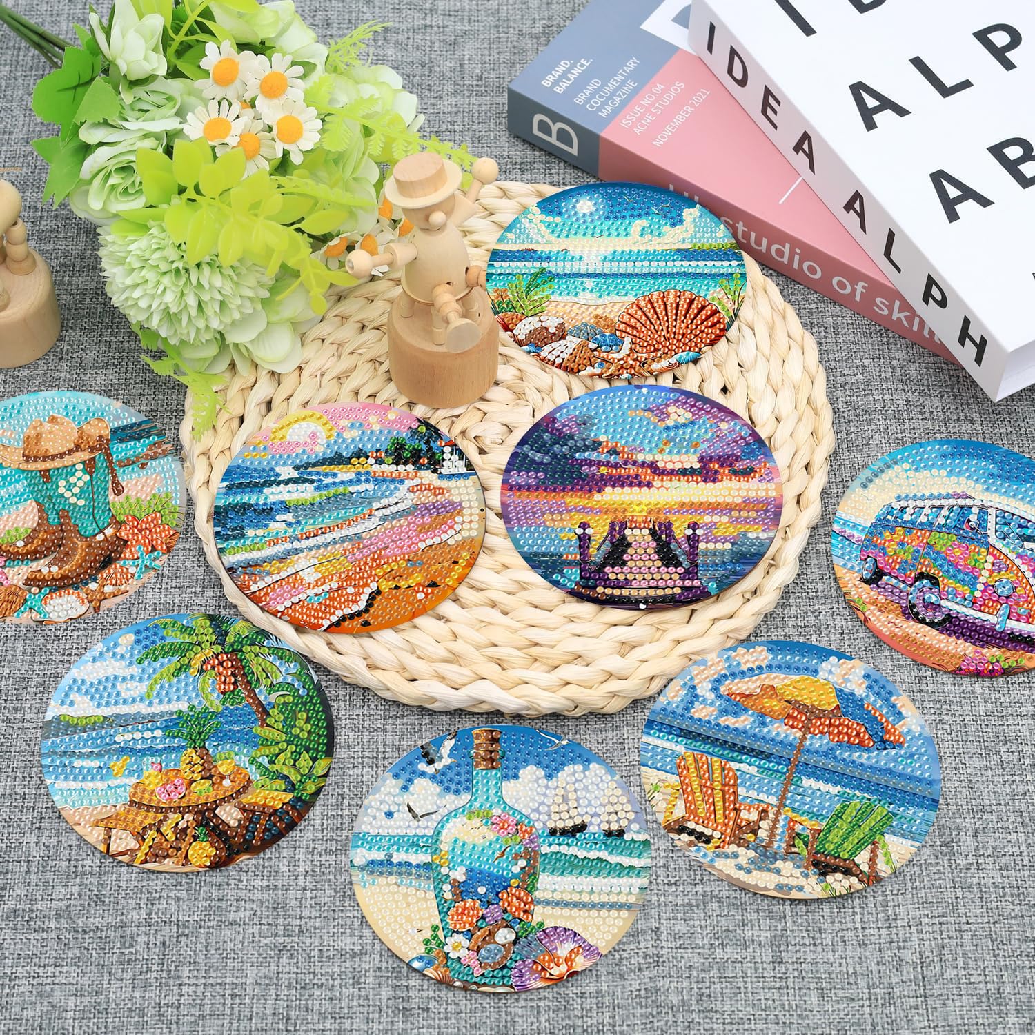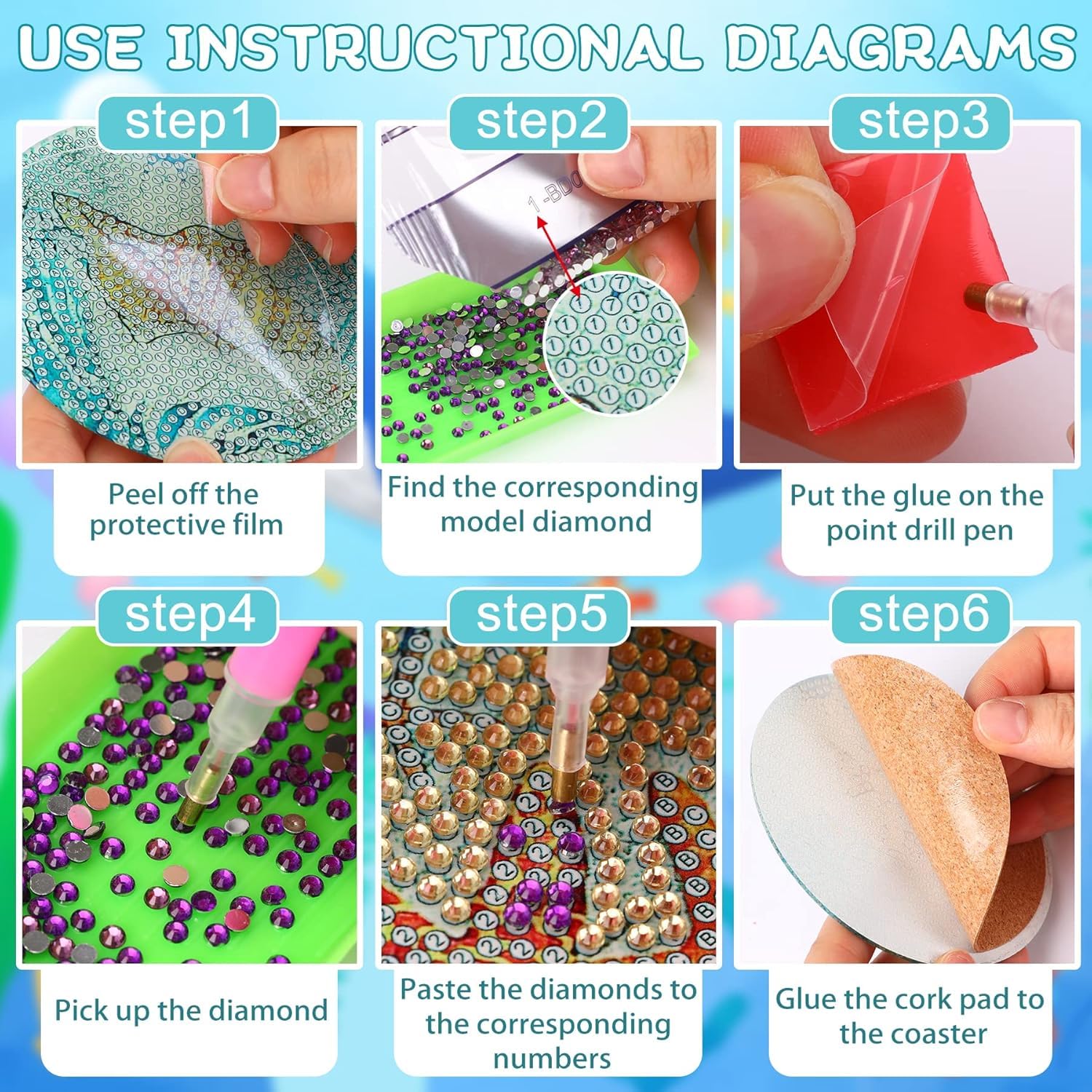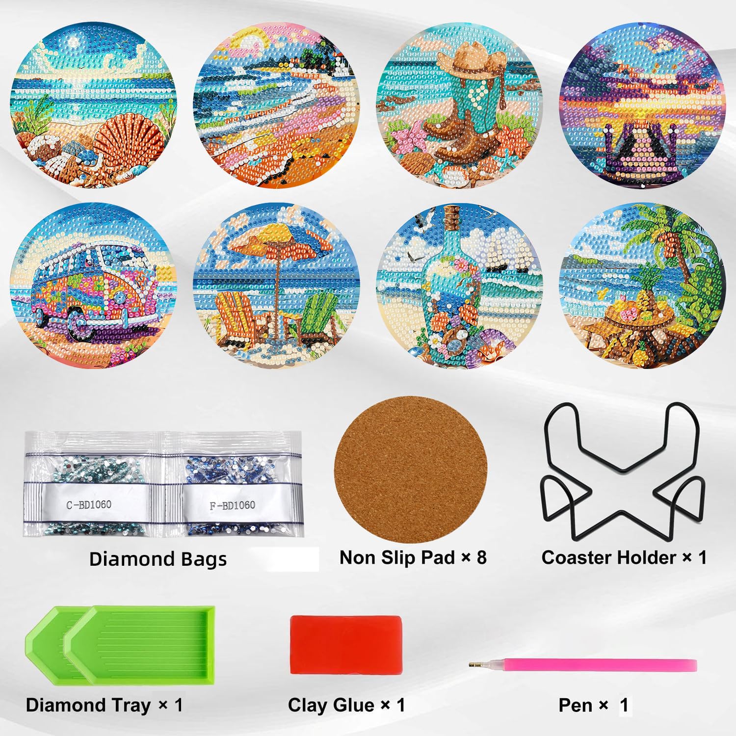 - Cork Backing: Each Beach diamond coaster has a natural cork backing, which protects furniture or table tops from scratches, and holds the coasters in place, prevents them from falling off the table top, protects table tops and countertops from high temperatures , and prevent the coasters from sticking to the glass