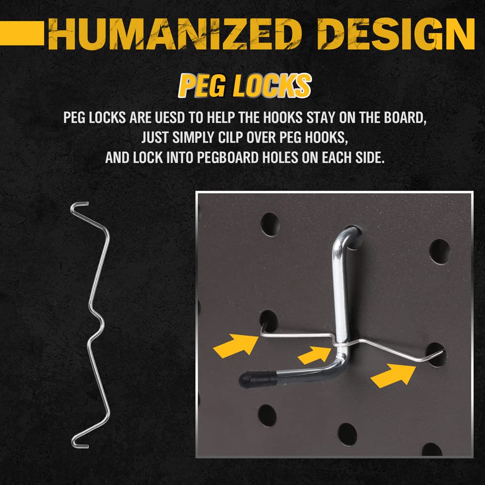 - Universal Pegboard Accessories suitable for 1/8" and 1/4" pegboards with 1" spacing. Each Small hook is equipped with a metal hook locks to help secure the hook stay on the board without falling out.