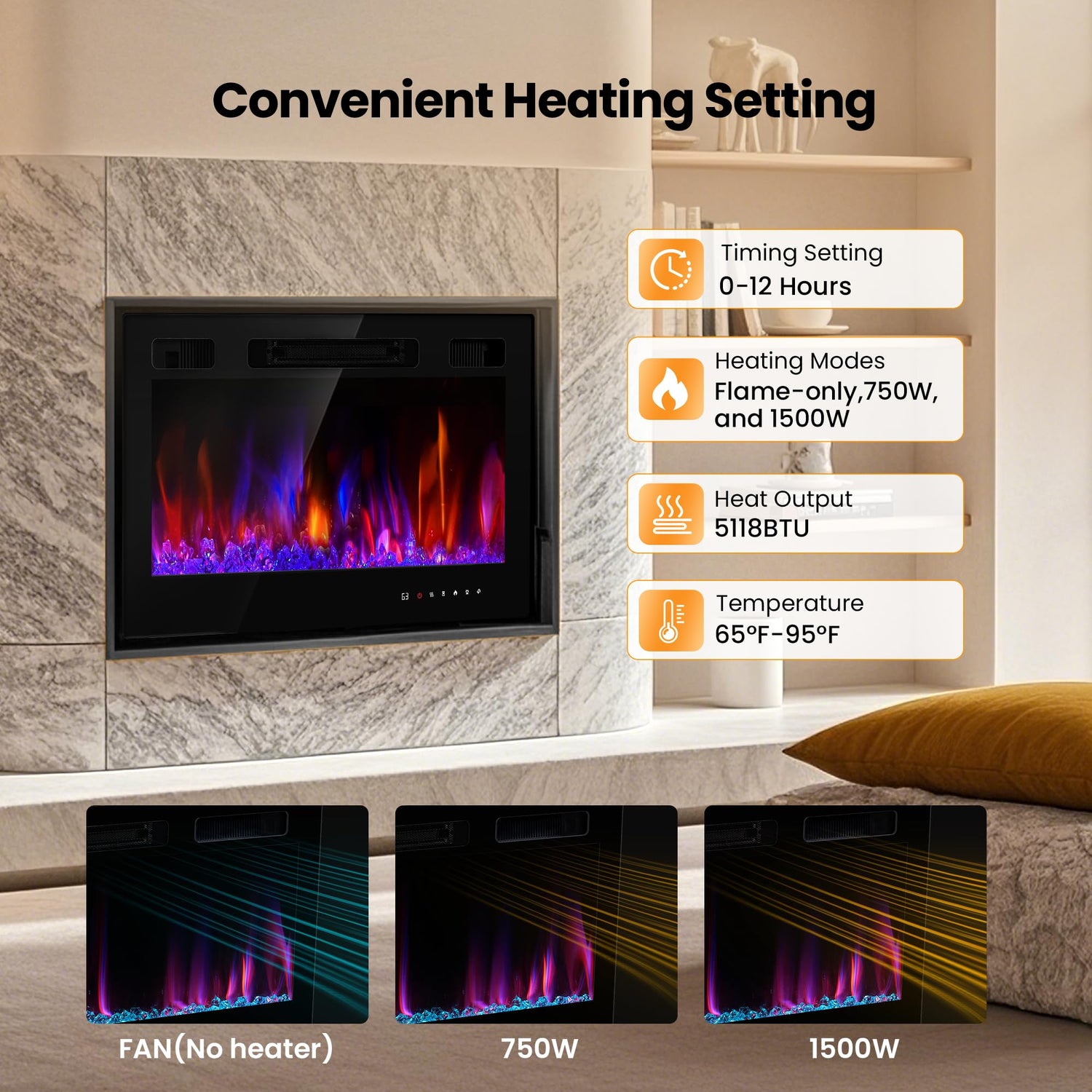 Electric Fireplace Insert 36" Realsmart 1500W Wall Mounted Fireplaces Recessed Heaters Remote Control Slim Black Fireplace Touch Screen Timer 12 Flame Colors LED Decor Low Noise