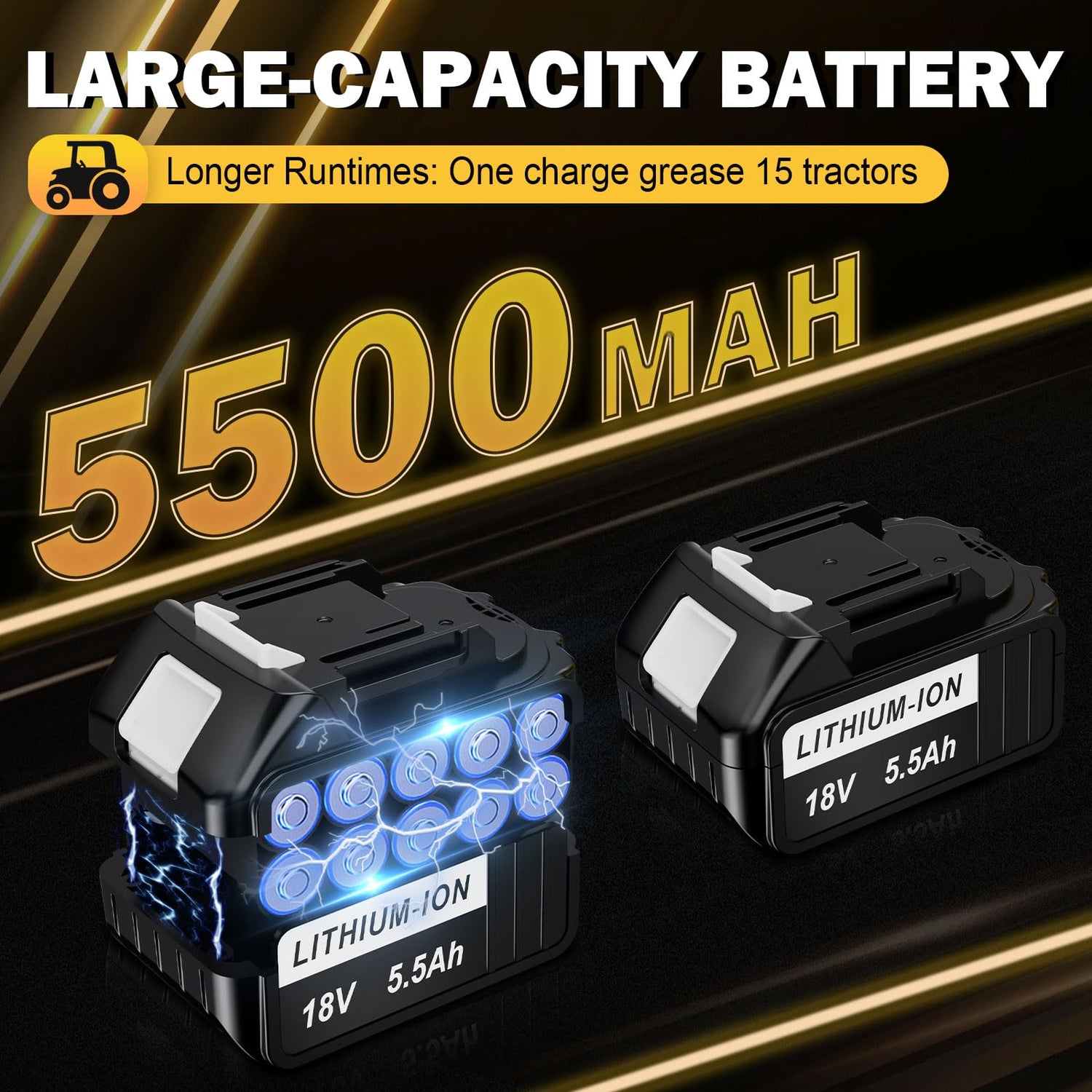 - 【Compatible with Makita Batteries】: Cordless grease gun is equipped with 5500mAh large capacity batteries, which can support you in greasing mechanical equipment for a long time anywhere, ensuring the normal operation of the equipment and extending its service life. The 5500 mAh rechargeable battery is durable and reliable, enabling continuous use. It has a fast charging speed and a long service life, which can extend the lubrication operation time. Our grease gun is compatible with Makita batteries.