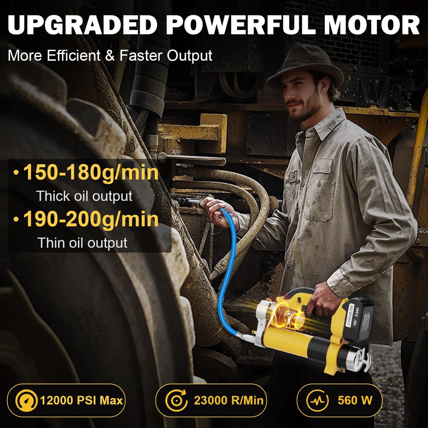 - 【Powerful & Efficient】: Electric grease gun with battery equipped with the upgraded powerful motor, the maximum output pressure can up to 12000 PSI, which pump out the lubricating grease quickly and smoothly. The grease gun simplifies lubrication tasks, making the lubrication process easier, more efficient, and time-saving. It is convenient for one-handed operation and can lubricate equipment effortlessly. Battery grease gun support both bulk and 14 oz cartridge grease loading.
