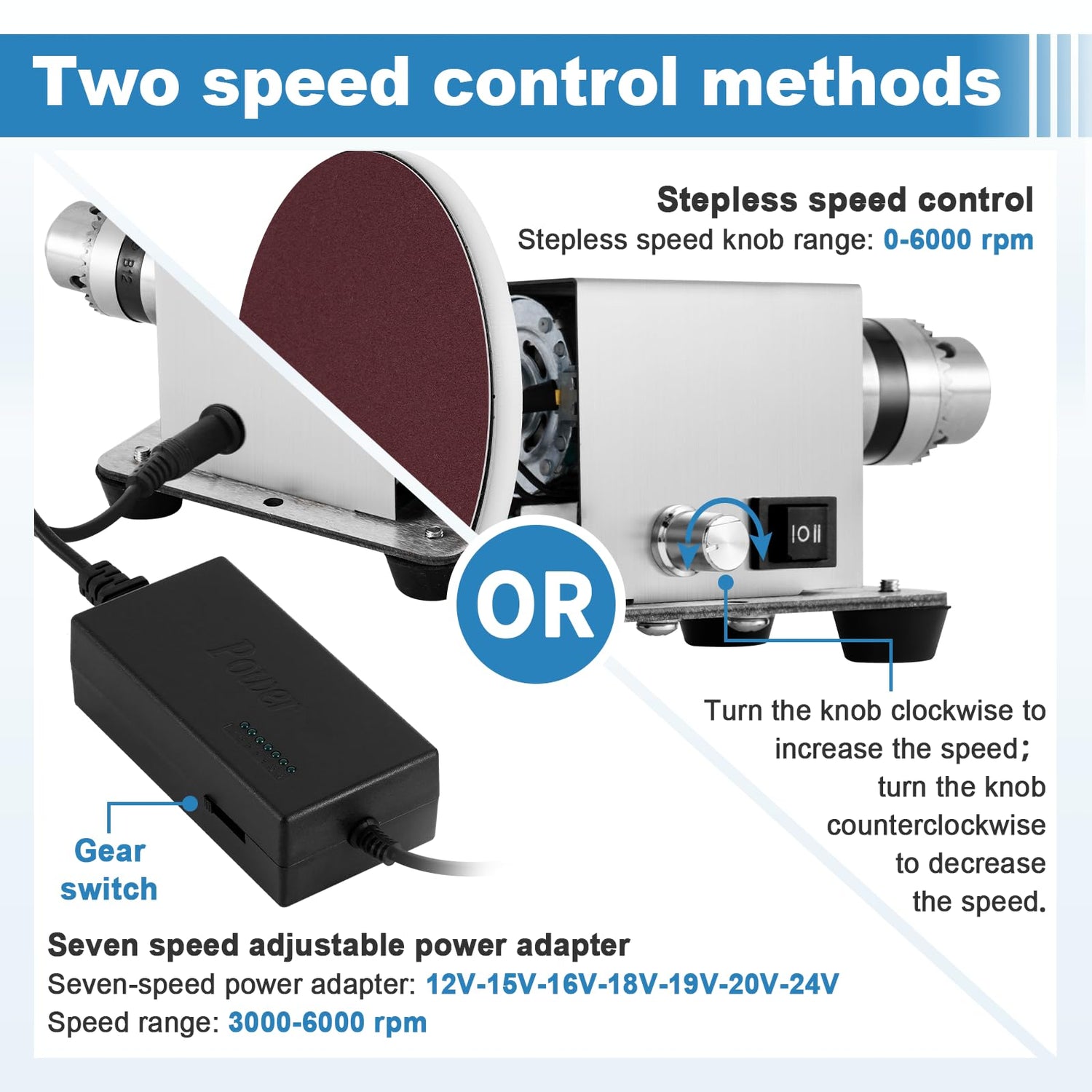 - [Two Speed Control Modes] 1, Stepless speed knob control: Turn the knob clockwise to increase the speed; turn the knob counterclockwise to decrease the speed, Speed range: 0-6000 rpm. 2, Seven-speed power adapter control: Speed range: 3000-6000 rpm