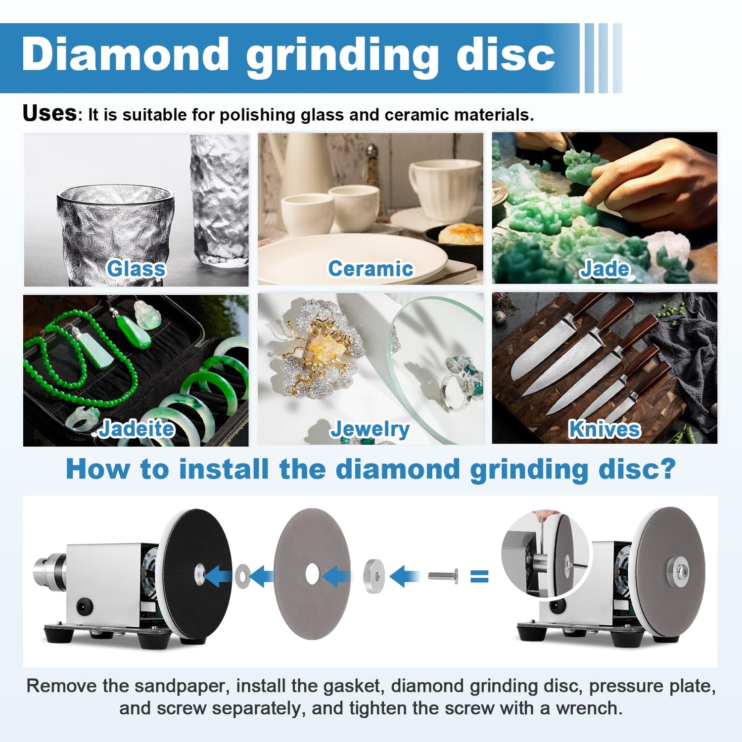 - [Diamond Grinding Disc] Our resin polishing machine can be installed diamond polishing sheet, 100 mm(3.94 inch) diameter, 16mm inner hole diameter, 1mm thickness, and 800 grit. It can be used to polish glass, ceramics, jade, jadeite, jewelry, knives, etc