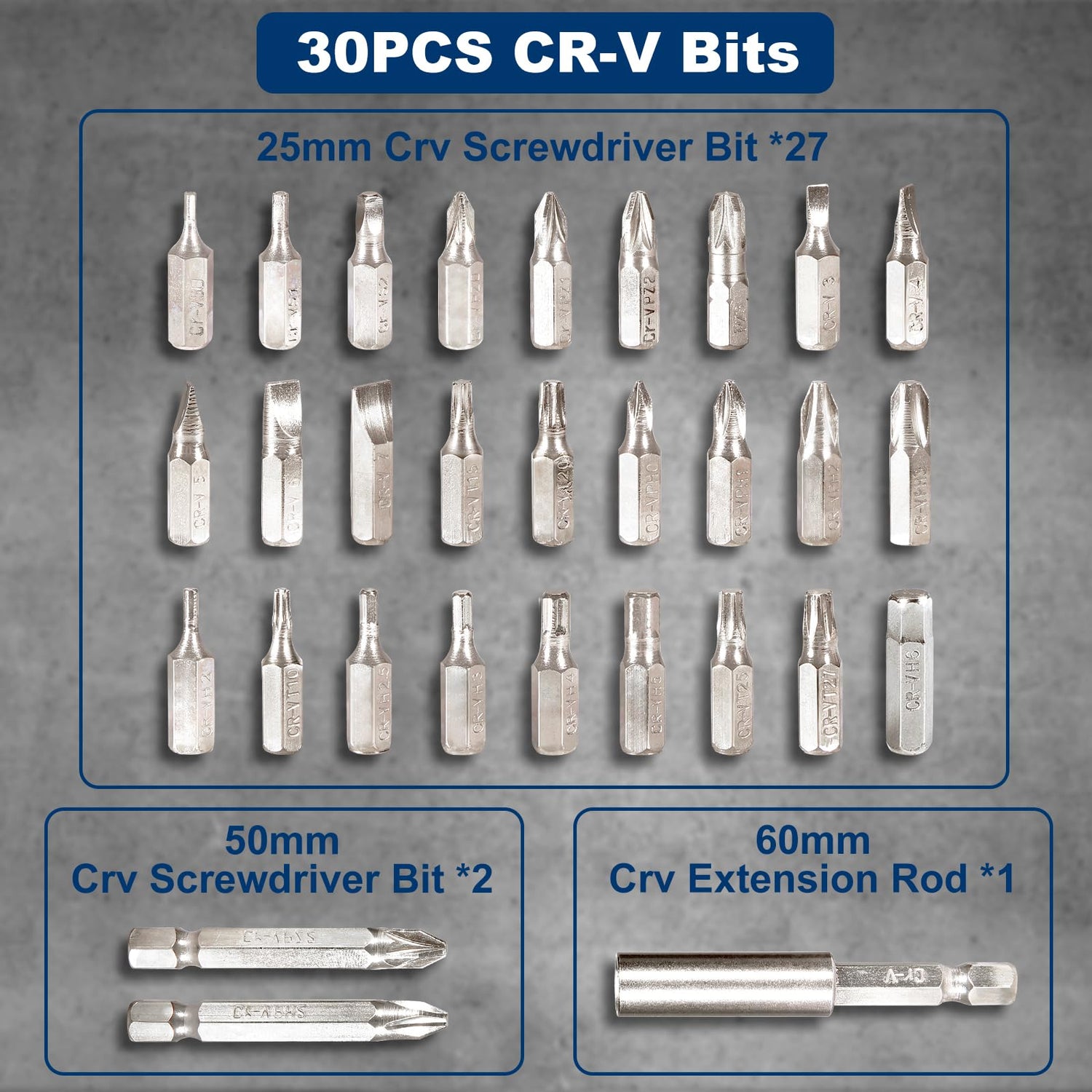 - Versatility for Projects: Electric screwdriver with built-in LED light achieve spinning in either a forward or reverse direction, making it convenient for completing DIY assembly projects in dark areas or simply working at night. Besides, it even does the basic job of effortlessly driving a screw into a hunk of wood or piece of metal. Heat treatment hardness of CRV bits up is up to 48-52HRC.