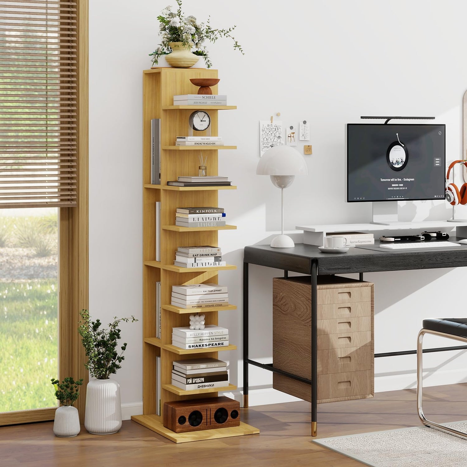 - Space-Saving Vertical Design: This tall narrow bookshelf is expertly designed to maximize vertical space, making it the narrow bookshelf for small spaces like apartments, offices, and corners. Its sleek profile provides ample storage without consuming valuable floor area, as shown in the lifestyle image of the cozy study nook