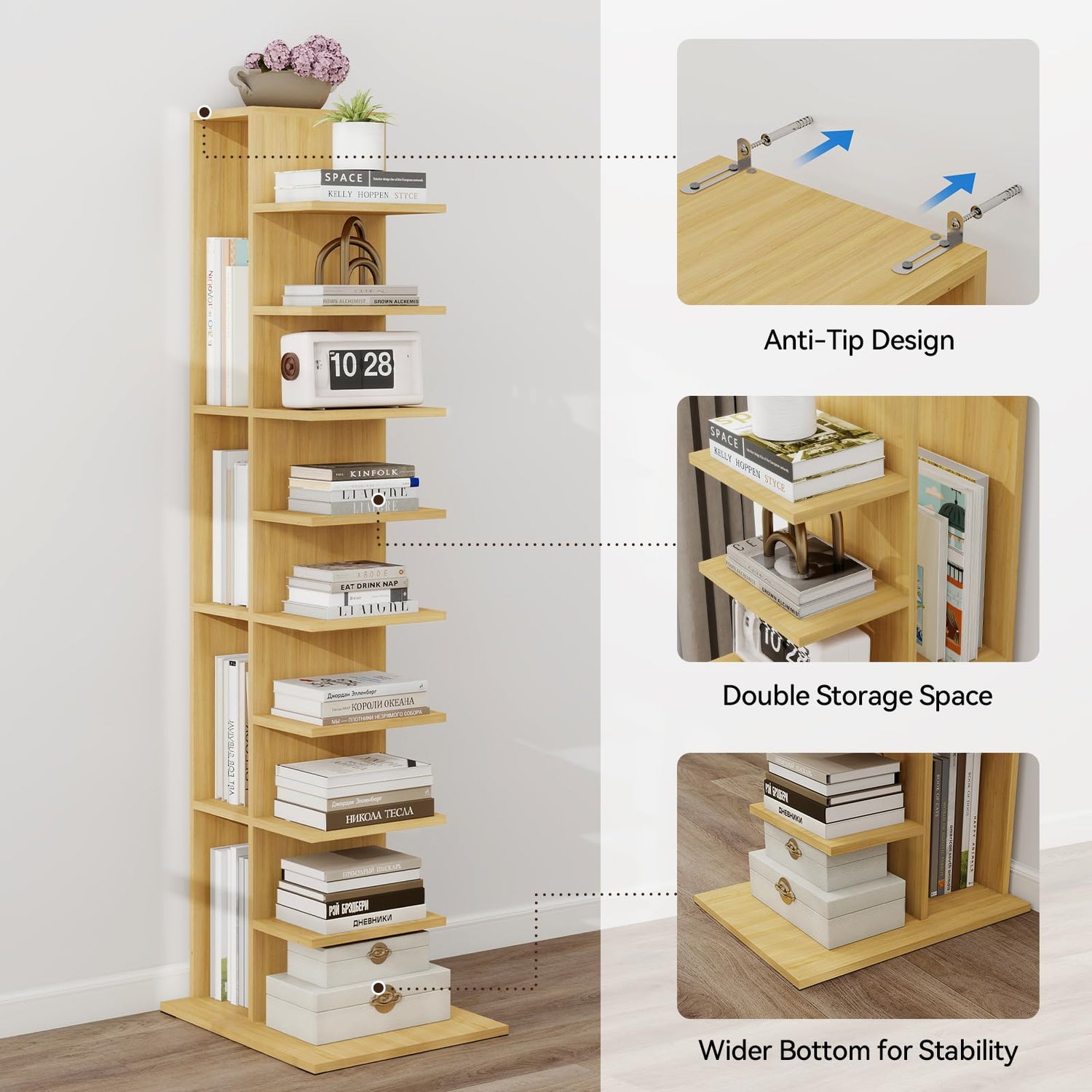 - Ultimate Stability and Safety: This vertical bookshelffeatures a prominently displayed anti-tip mechanism and an extra-wide bottom base, ensuring stability even when fully loaded. Rest assured, this sturdy narrow bookcasewill stand securely, protecting your items and your family